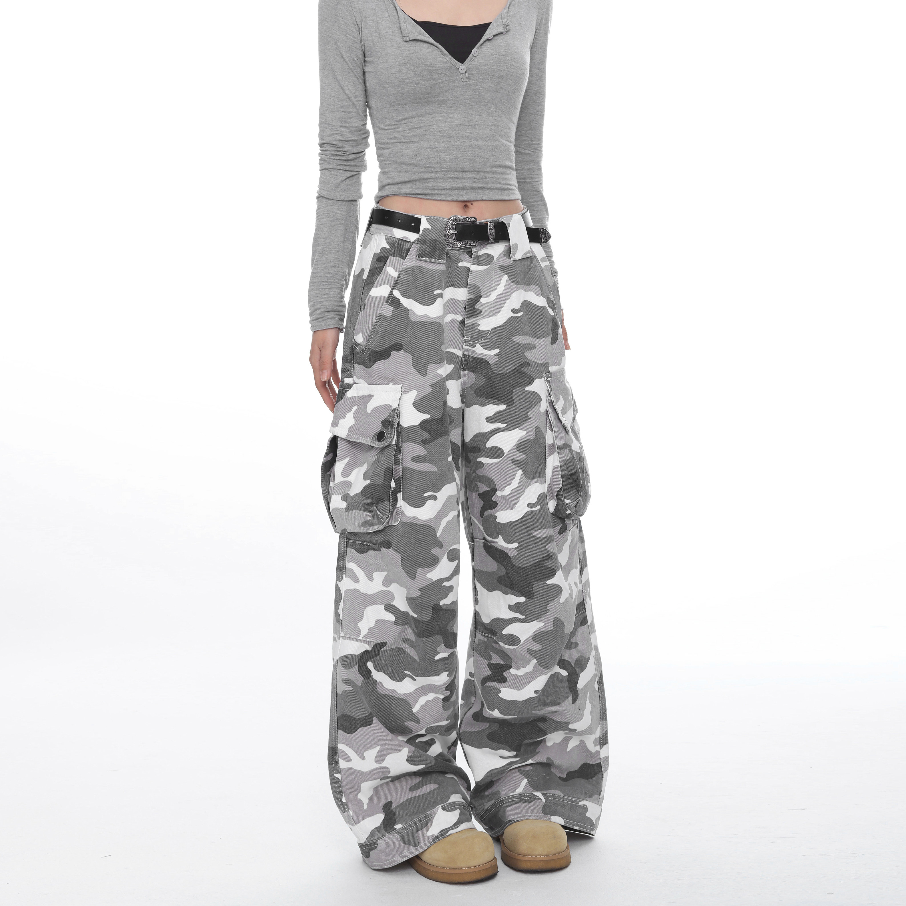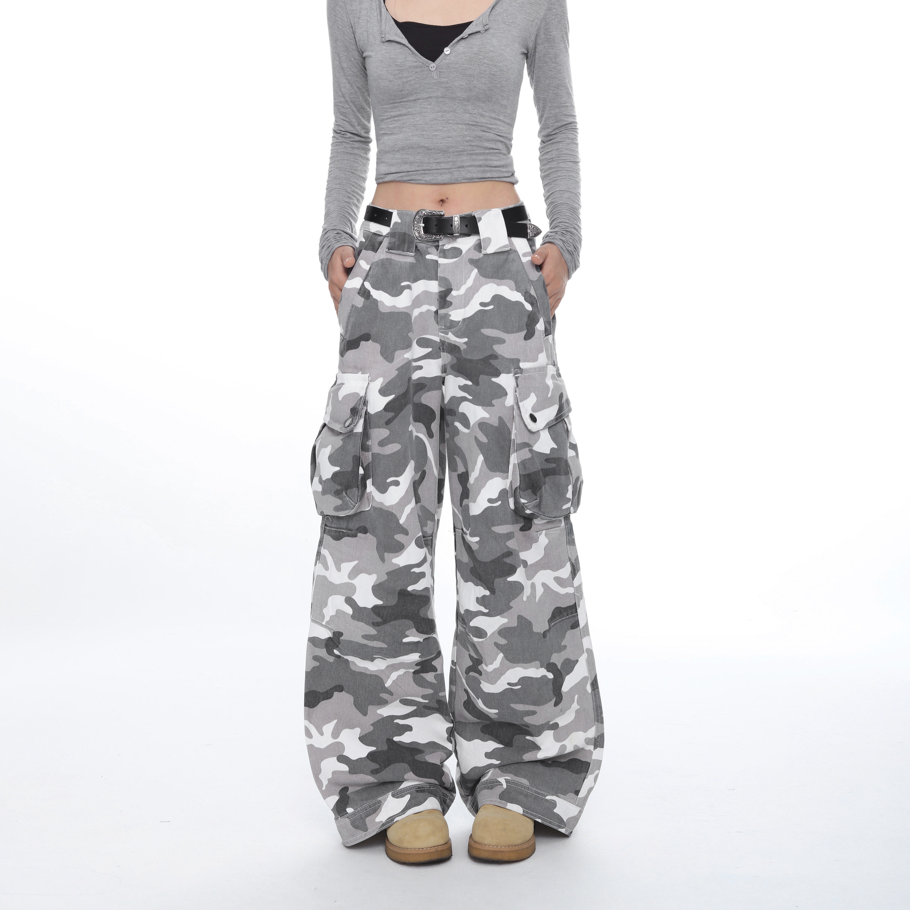 📚 COCKTAIL BAR美式高街灰白迷彩水洗弯刀阔腿裤男女多口袋vibe裤子