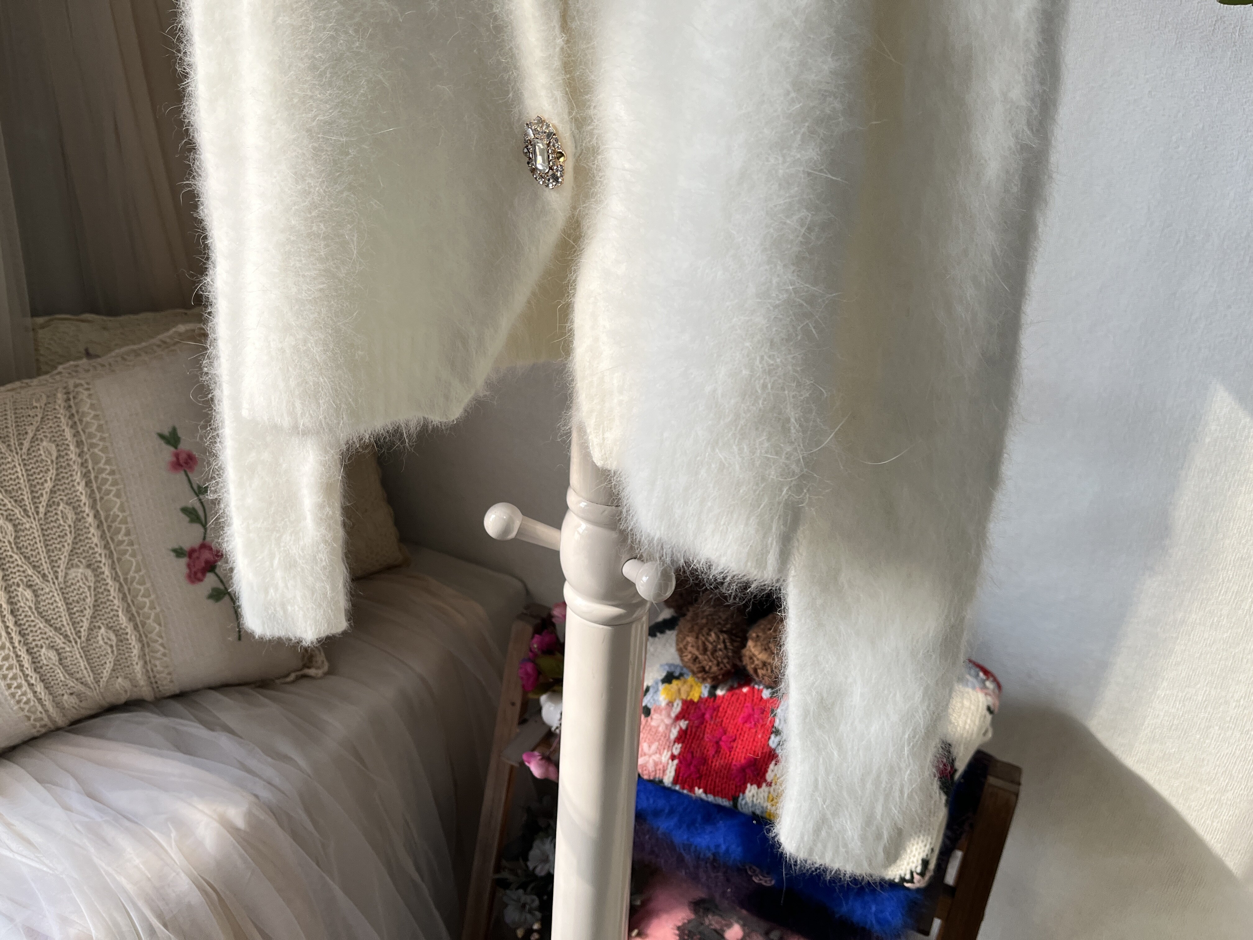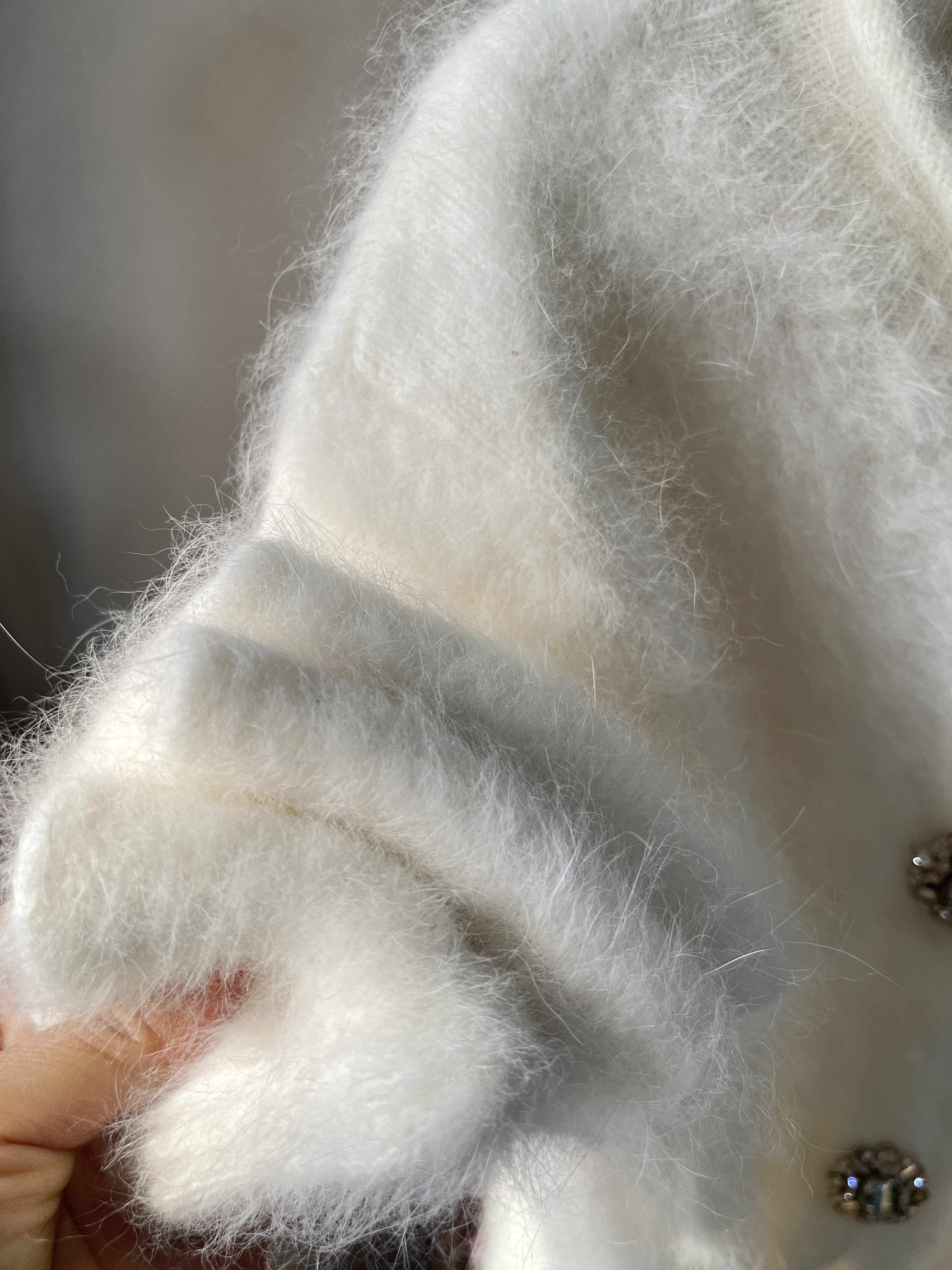 💖亲们,今天要跟大家分享的是一款超暖心的小众好物——日系纯白色圆领水晶扣长毛毛超柔兔毛极简风开衫短款毛衣!真的是一见钟情的感觉,让我忍不住想要分享给大家!