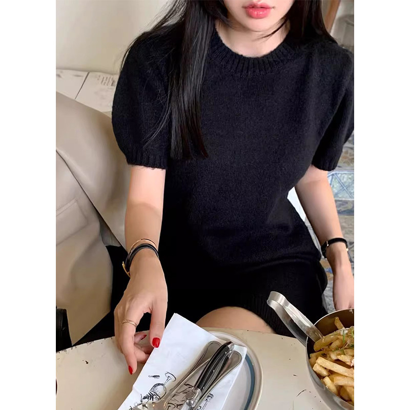 📚 韩国chic秋冬简约气质圆领软糯宽松休闲短袖针织打底毛衣连衣裙女