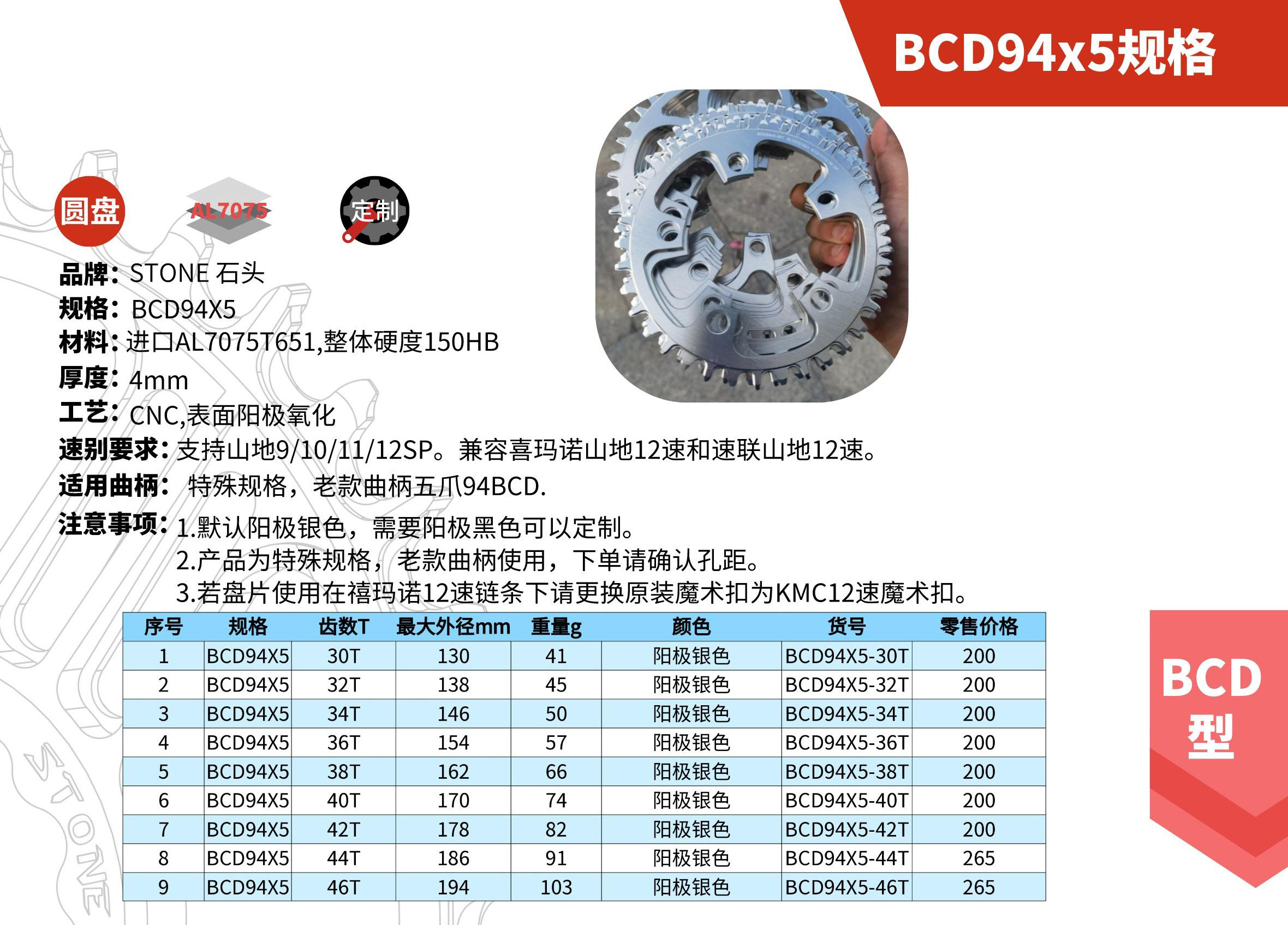 📚 STONE BCD94 五爪曲柄用单盘正负齿 牙盘 盘片