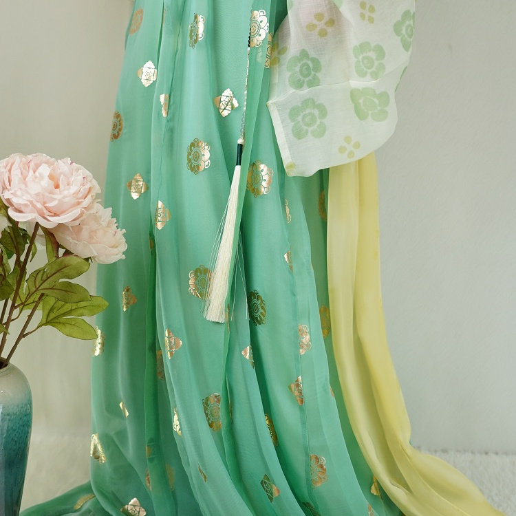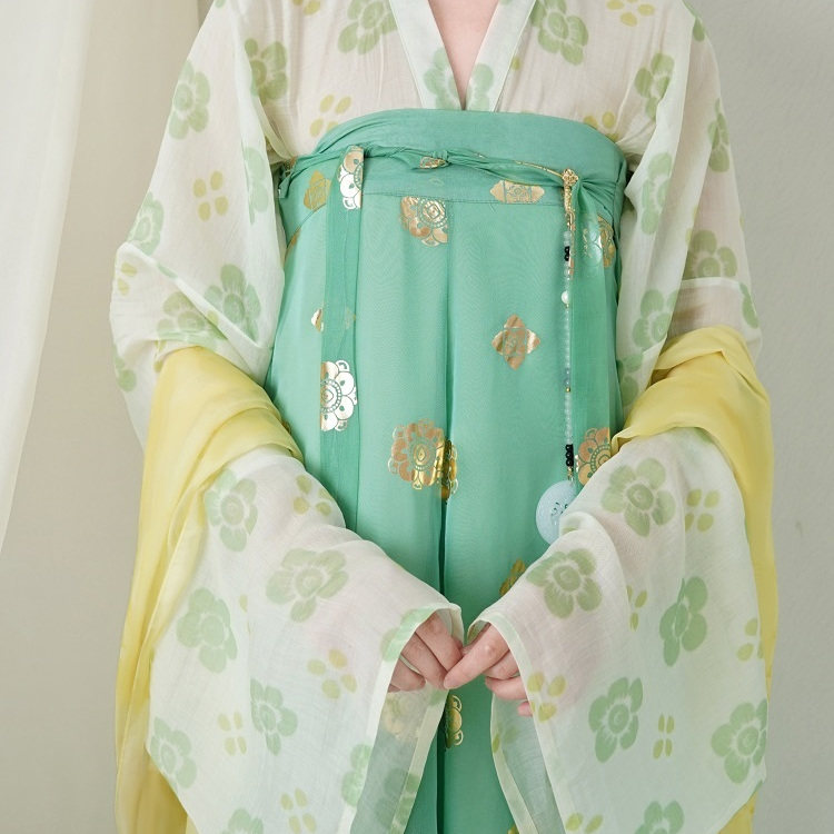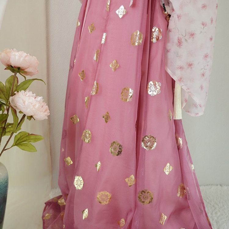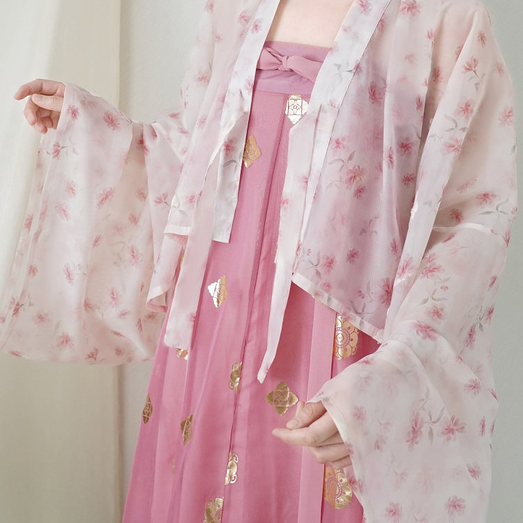 📚 青泠谷齐胸一片式粉色小桃花法门寺披衫白底绿花衫雪纺烫金齐胸裙