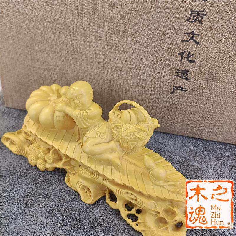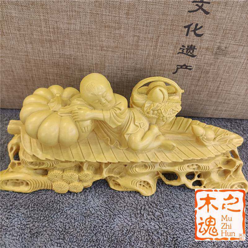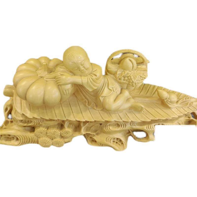 📚 黄杨木雕刻中式玄关童男家居装饰品汽车摆件好年头满载而归工艺品