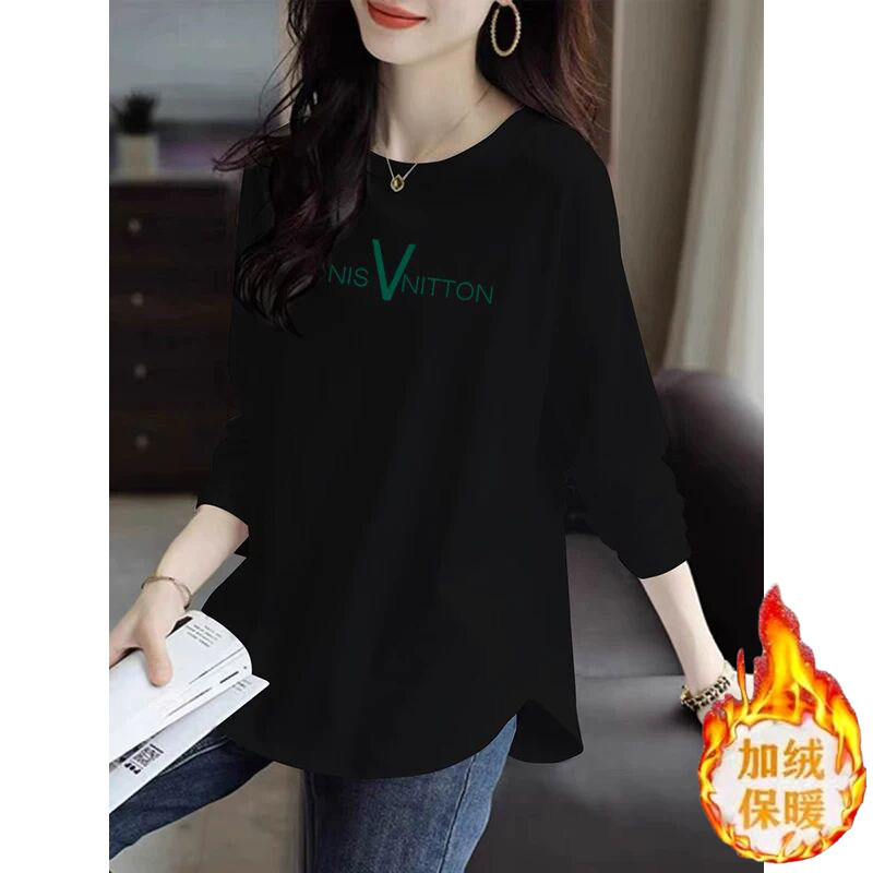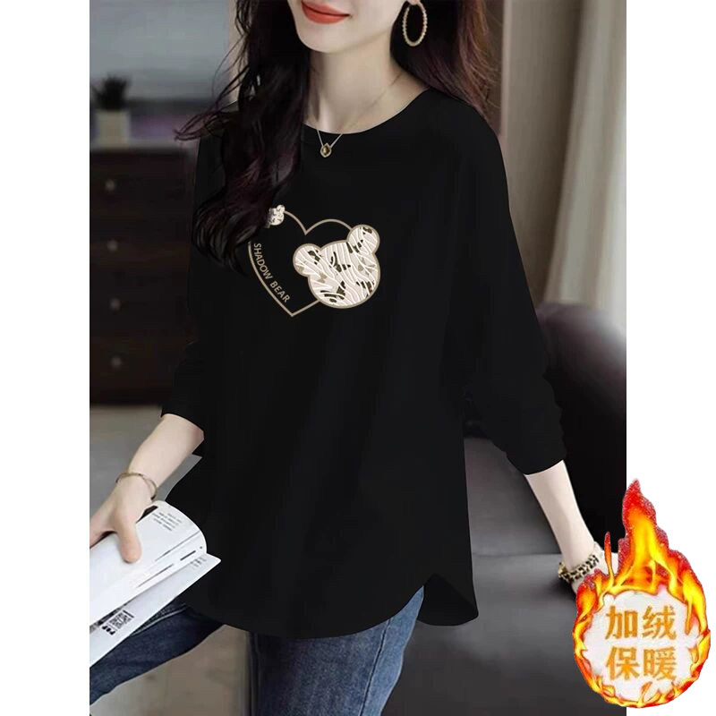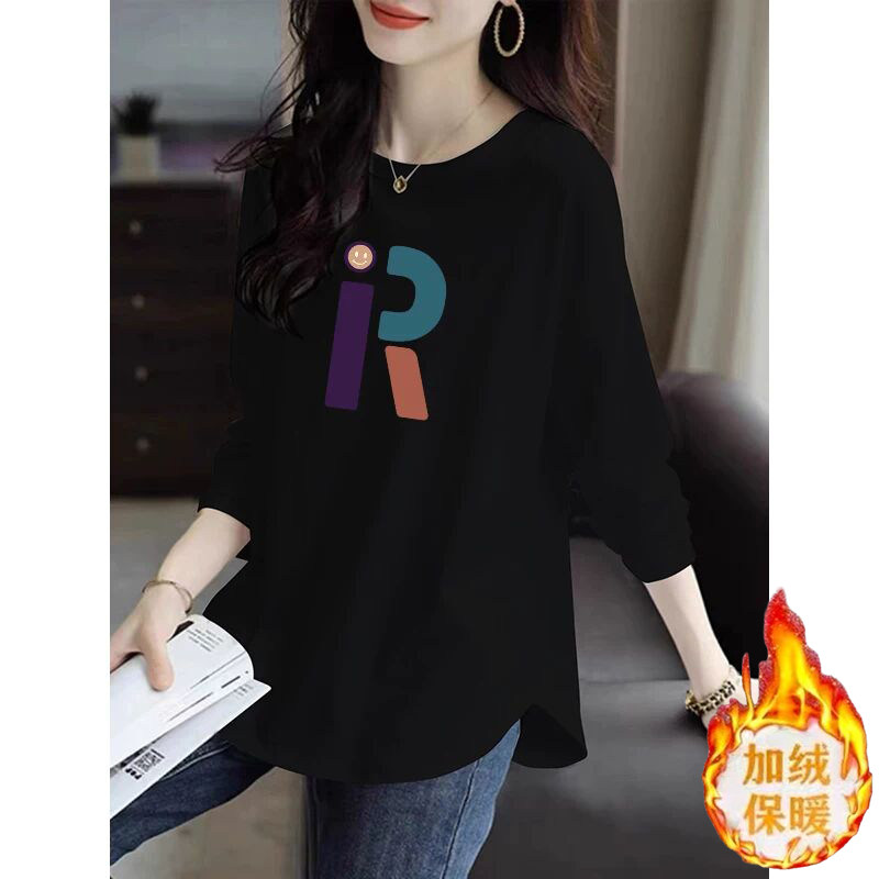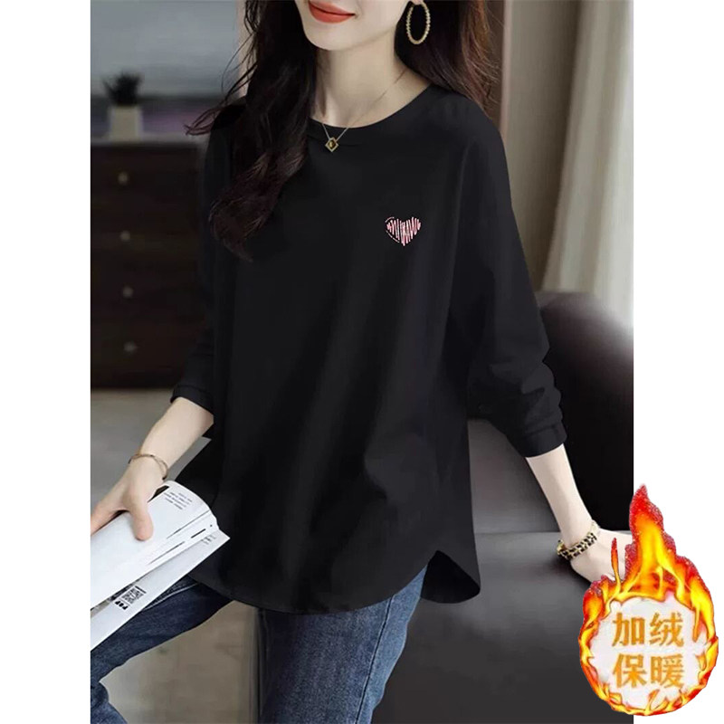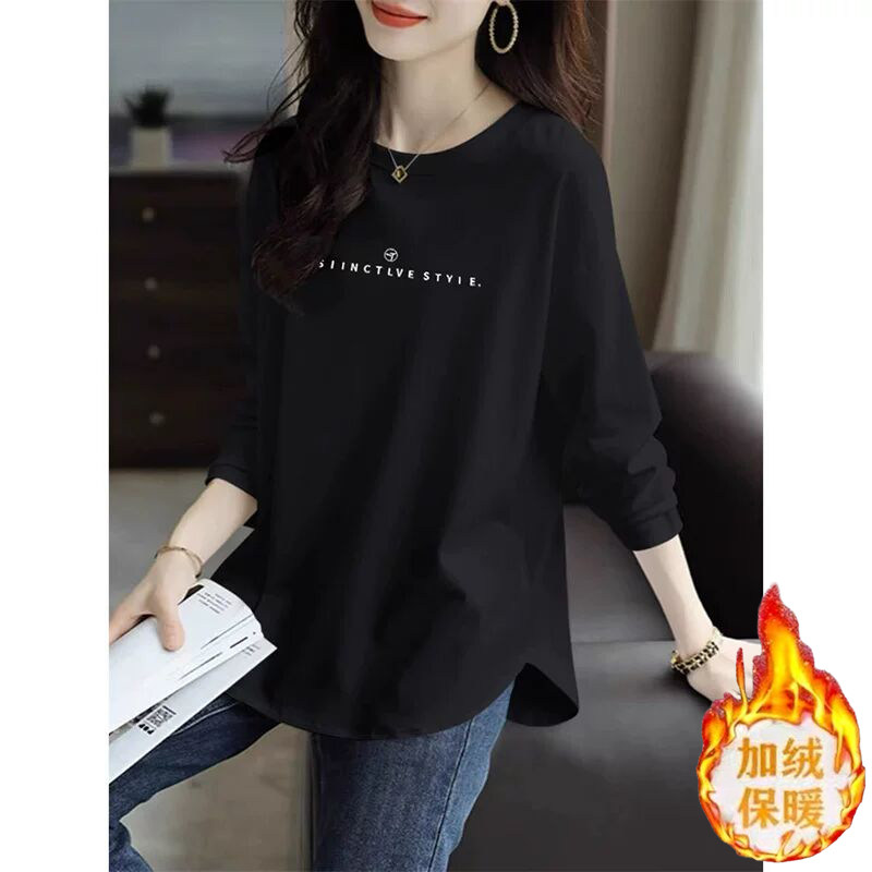 📚 秋冬季加绒加厚中长款遮屁股保暖打底衫大码上衣弧形下摆长袖T恤