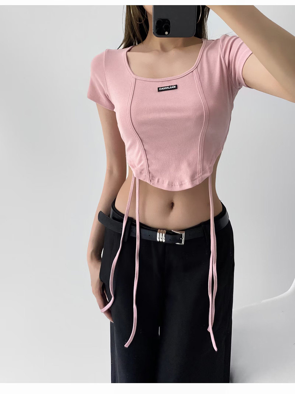 📚 美式复古弧形露腰绑带短款露脐上衣女夏设计感修身显瘦不规则短袖