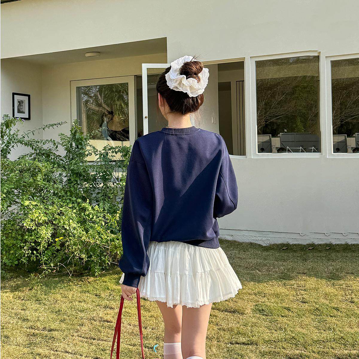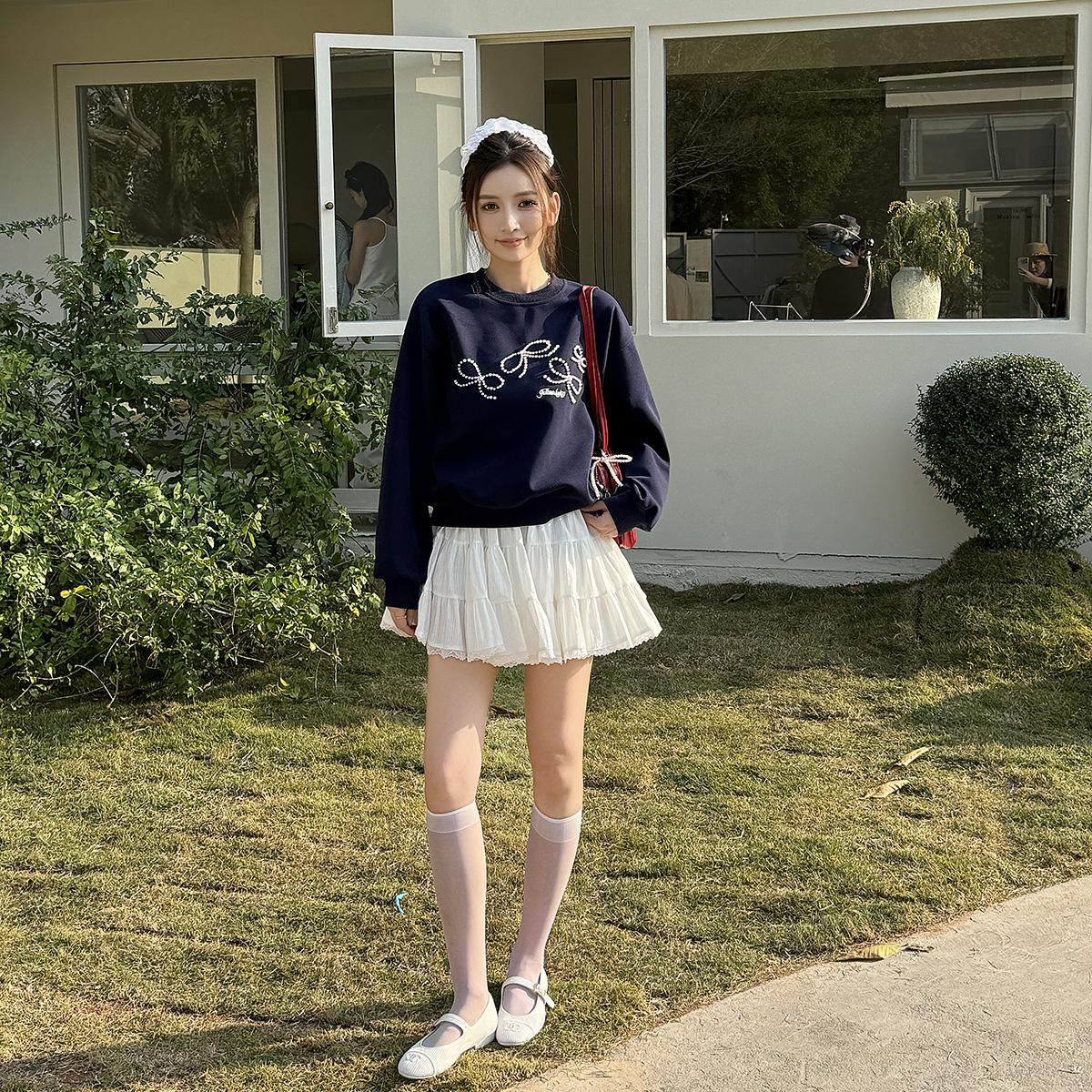 📚 浅布调QBD 春季新款圆领设计感藏蓝色珍珠蝴蝶结套头短款卫衣女