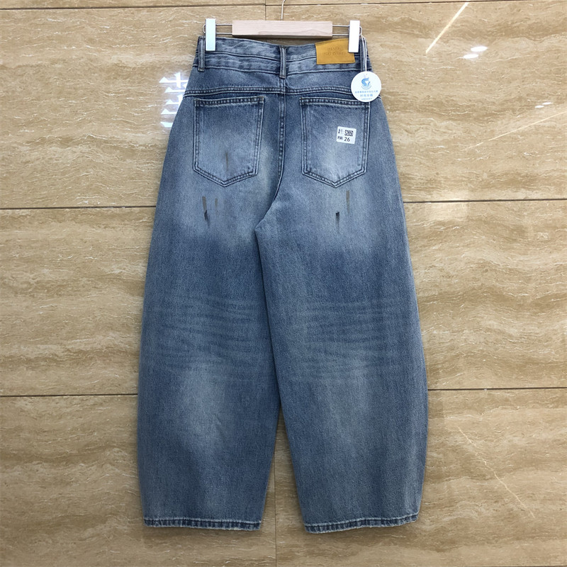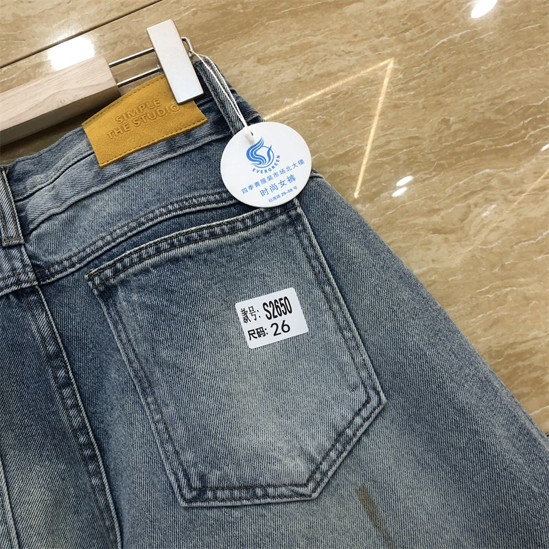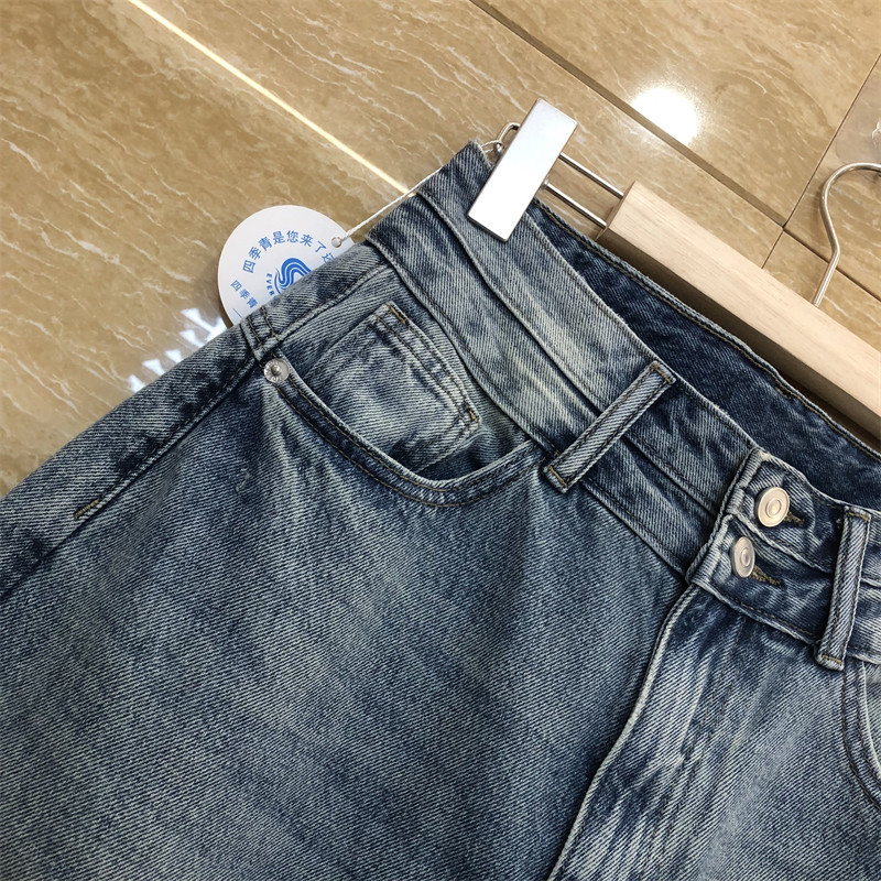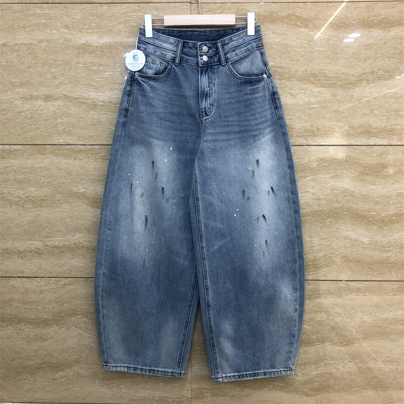 📚 欧洲站2650设计感双腰头油漆花点两粒扣贴标春装薄款浅色牛仔裤女