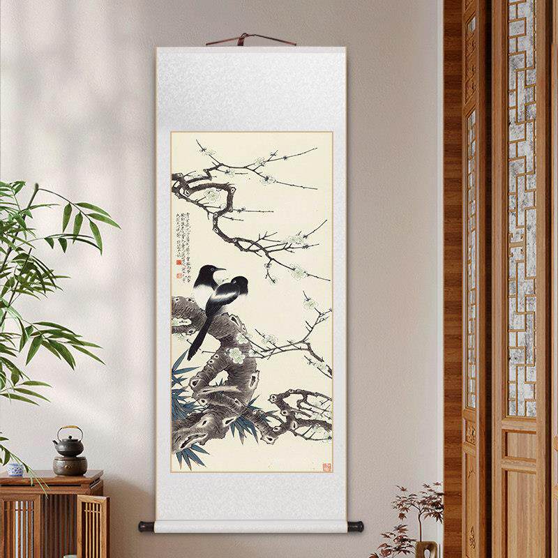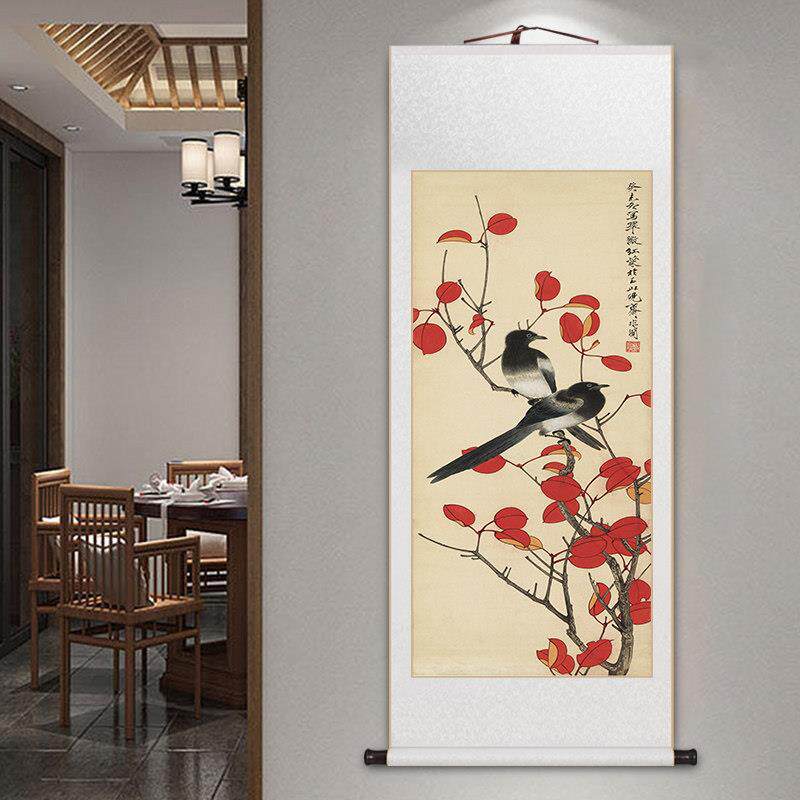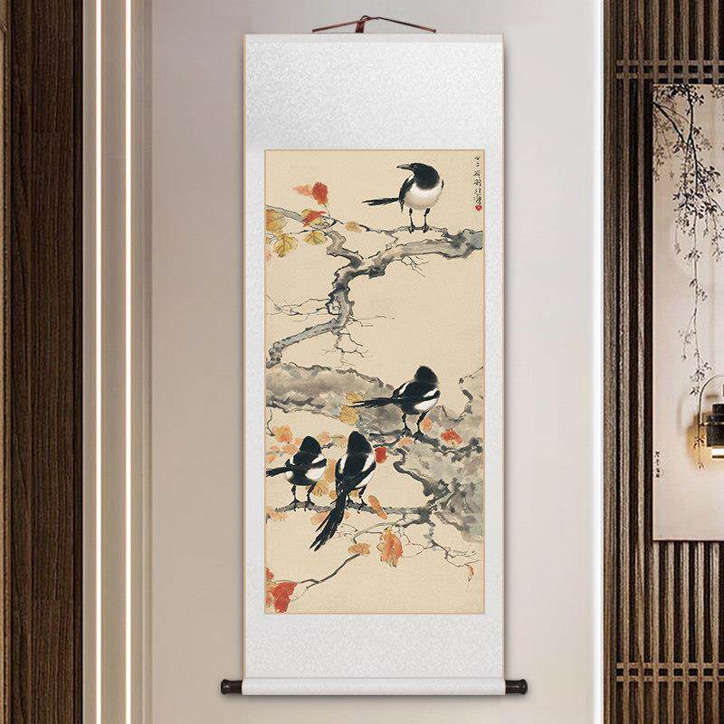 📚 四溪画花鸟卷轴挂画名画喜鹊画喜庆客厅装饰画书房茶室入口画中国
