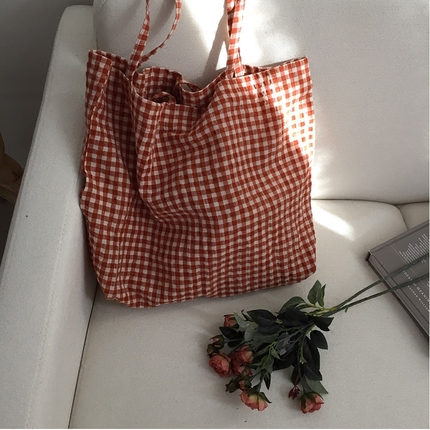 📚 自制(夏季限定) 小红格子布包 清爽可爱~韩国单肩学院帆布包女