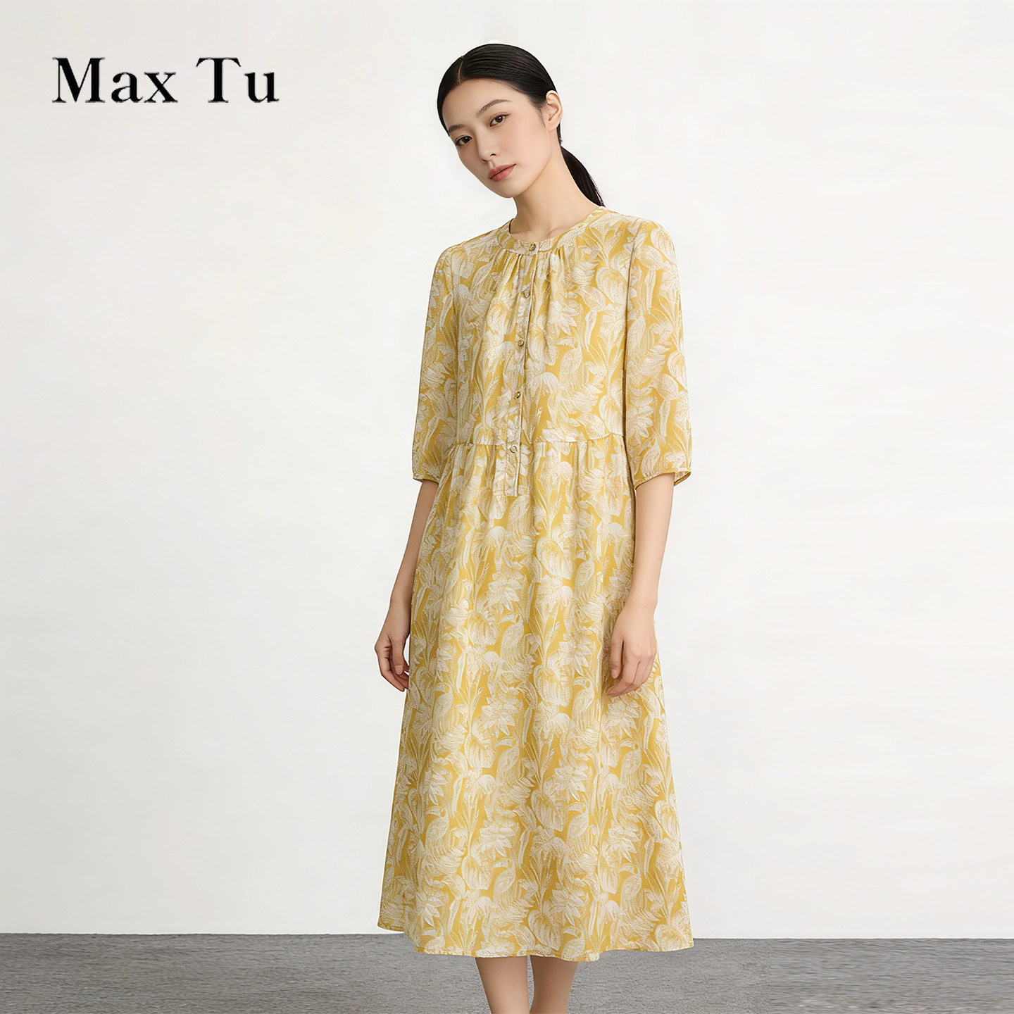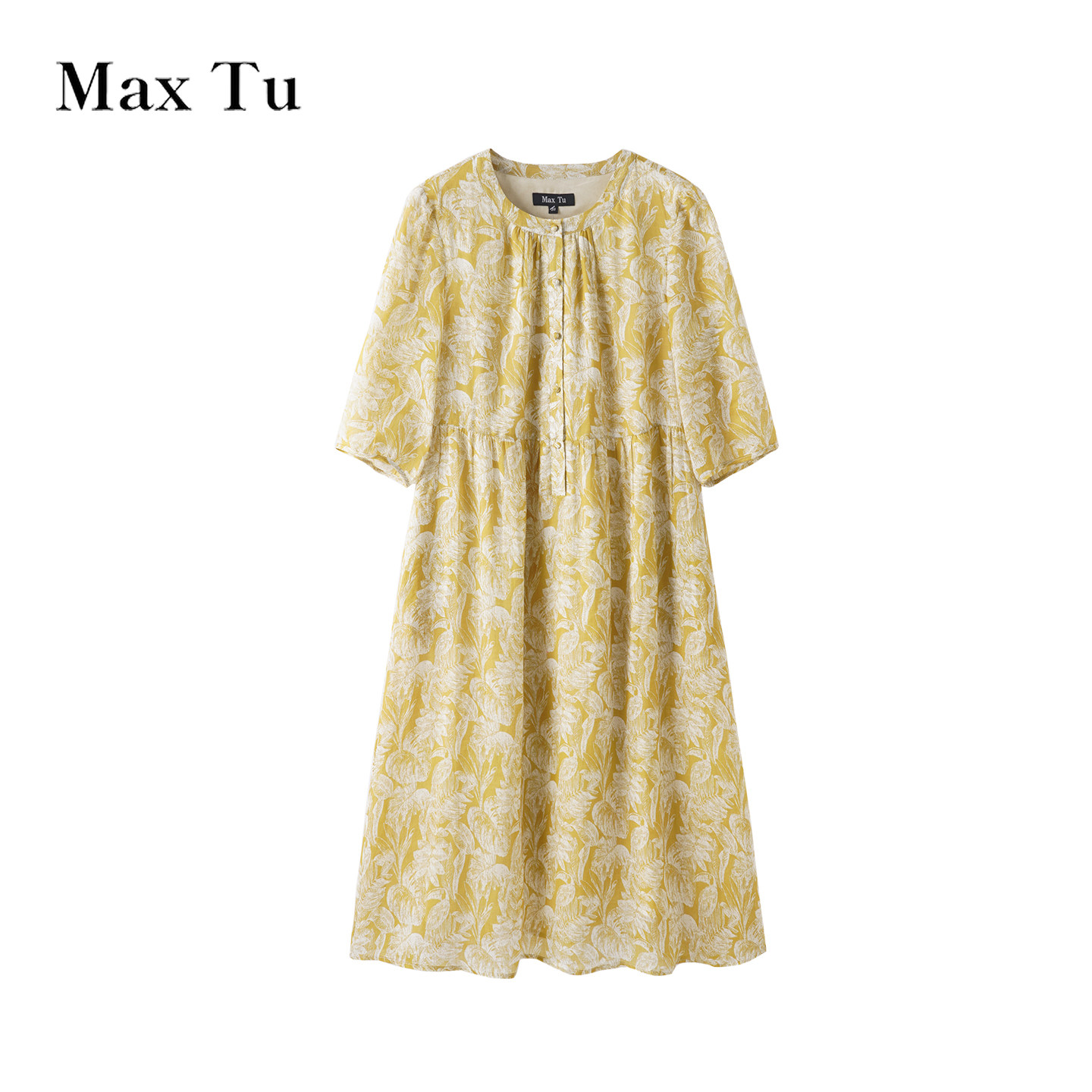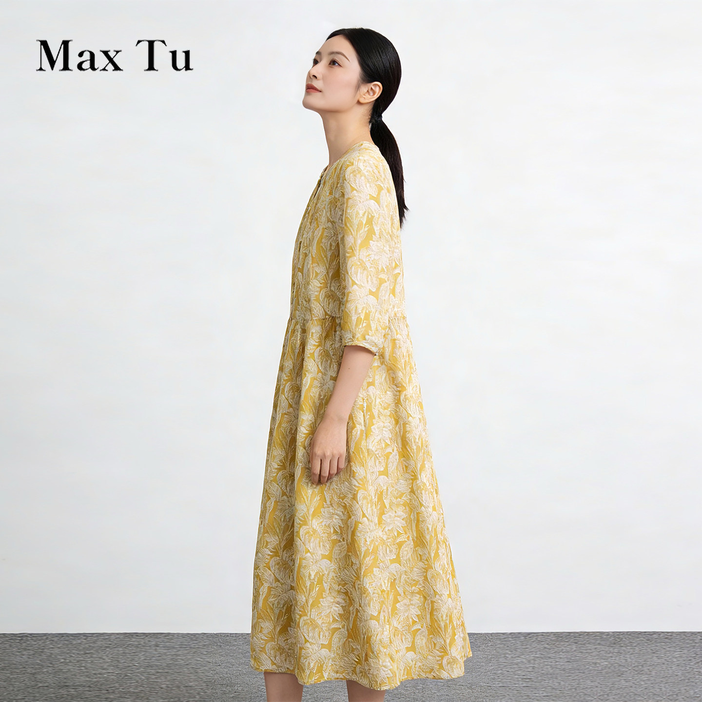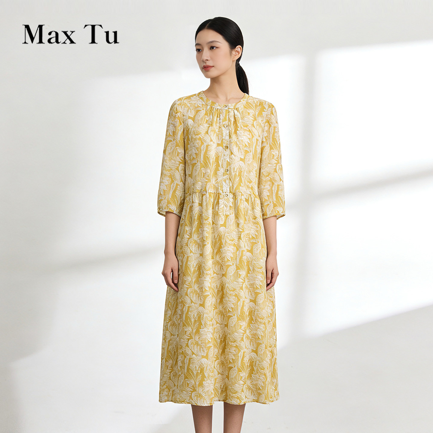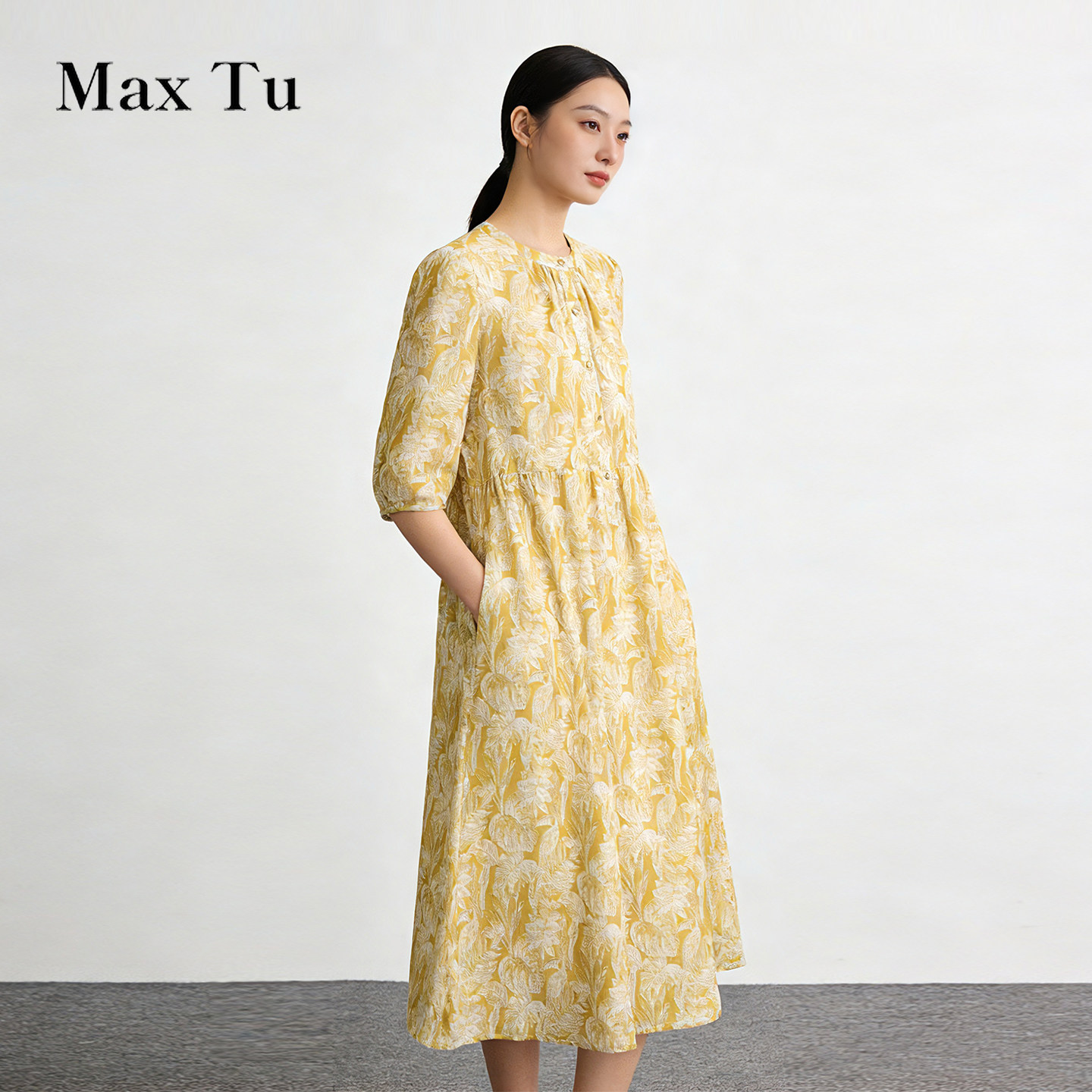 📚 Max Tu女装2026春夏法式田园风印花连衣裙中袖收腰水洗苎麻中长裙