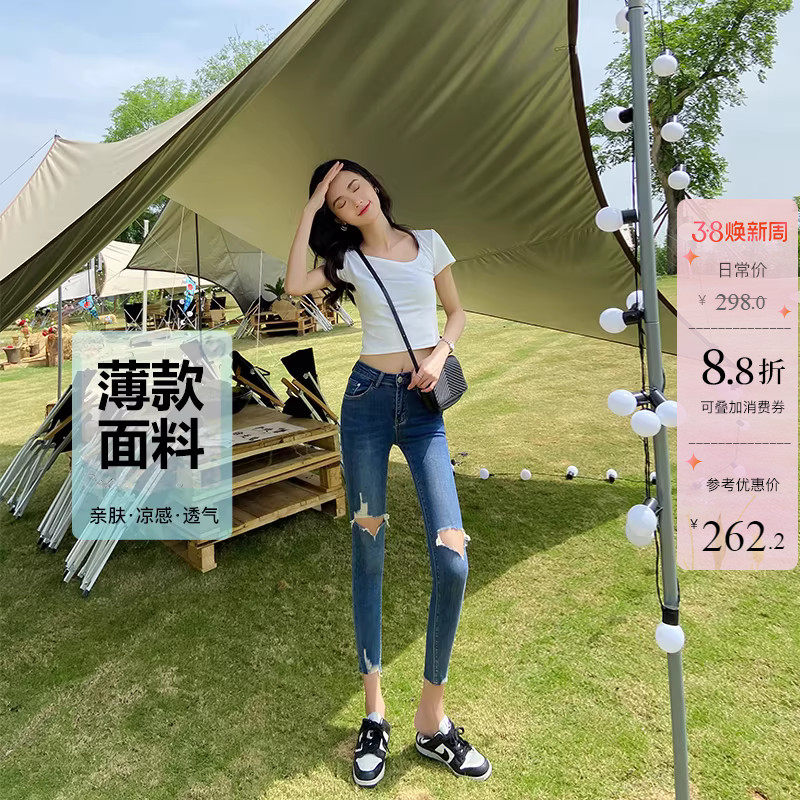 98¥ HU926 x9rpUuWjzl1¥ https://m.tb.cn/h.i2qMqAN 春秋新款深蓝色破洞中高腰牛仔裤女巨显瘦紧身九分弹力毛边小脚裤 --------------------- 【原售价】338元 【现售价】298元。