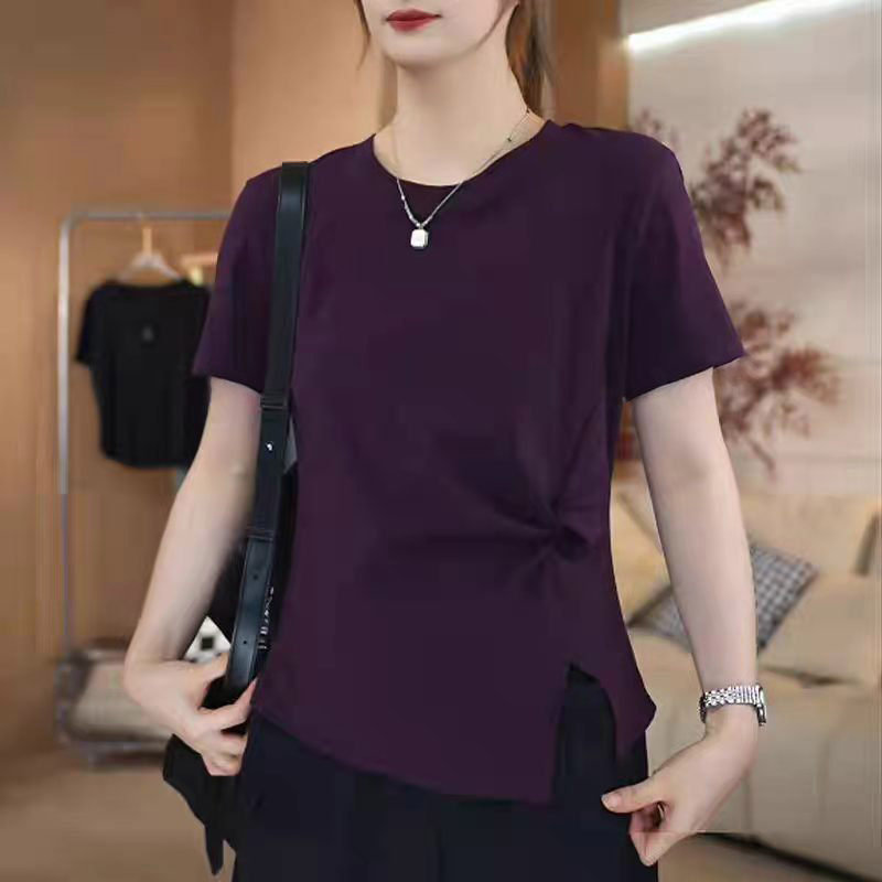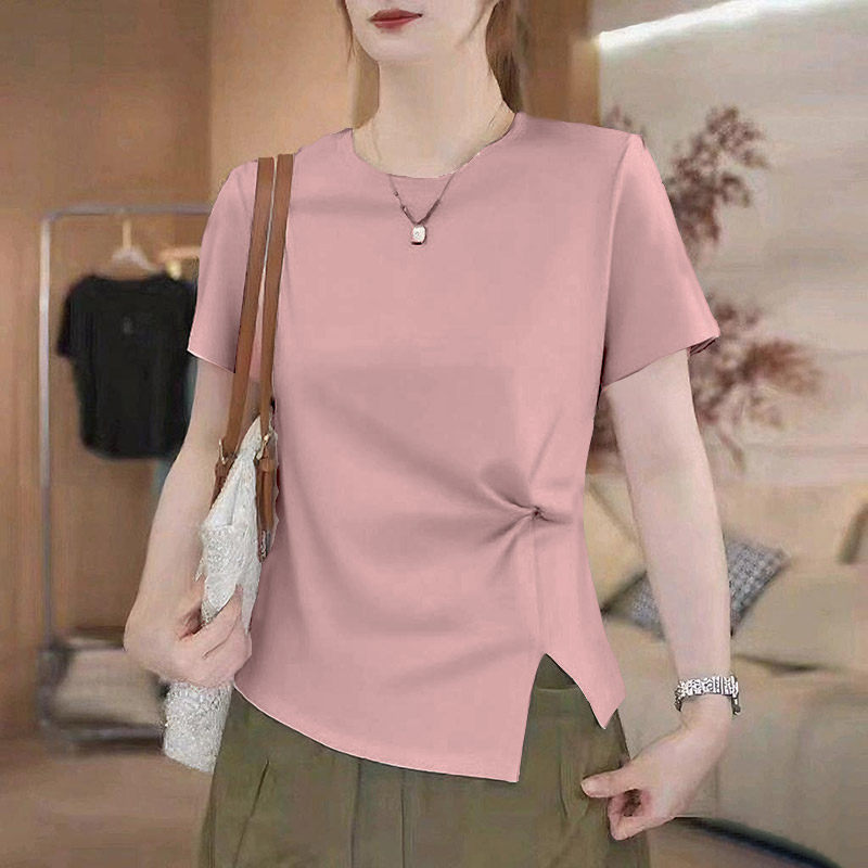 📚 别致圆领短袖t恤女新款夏季不规则开叉下摆百搭显瘦遮肚正肩上衣
