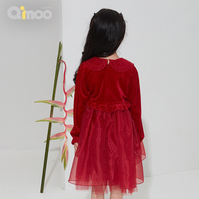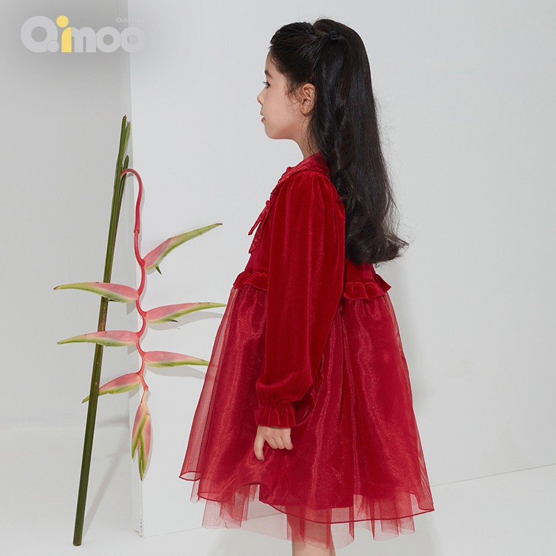 📚 淇木Qimoo童装女童拼接网纱绣花丝绒公主连衣裙QMT1LP101A