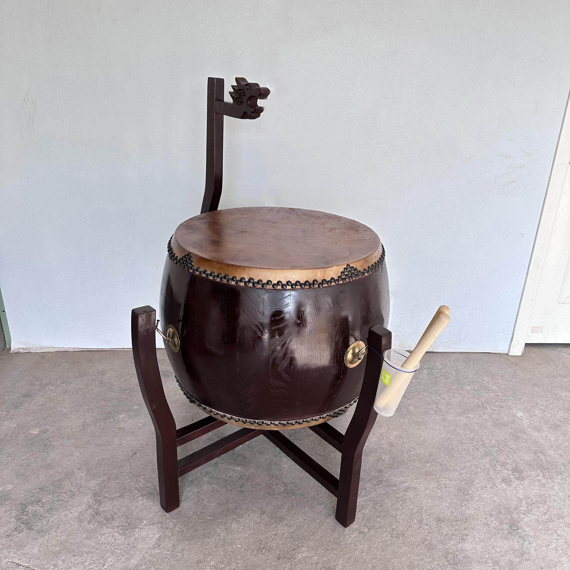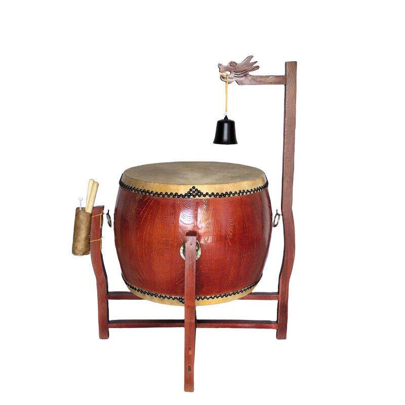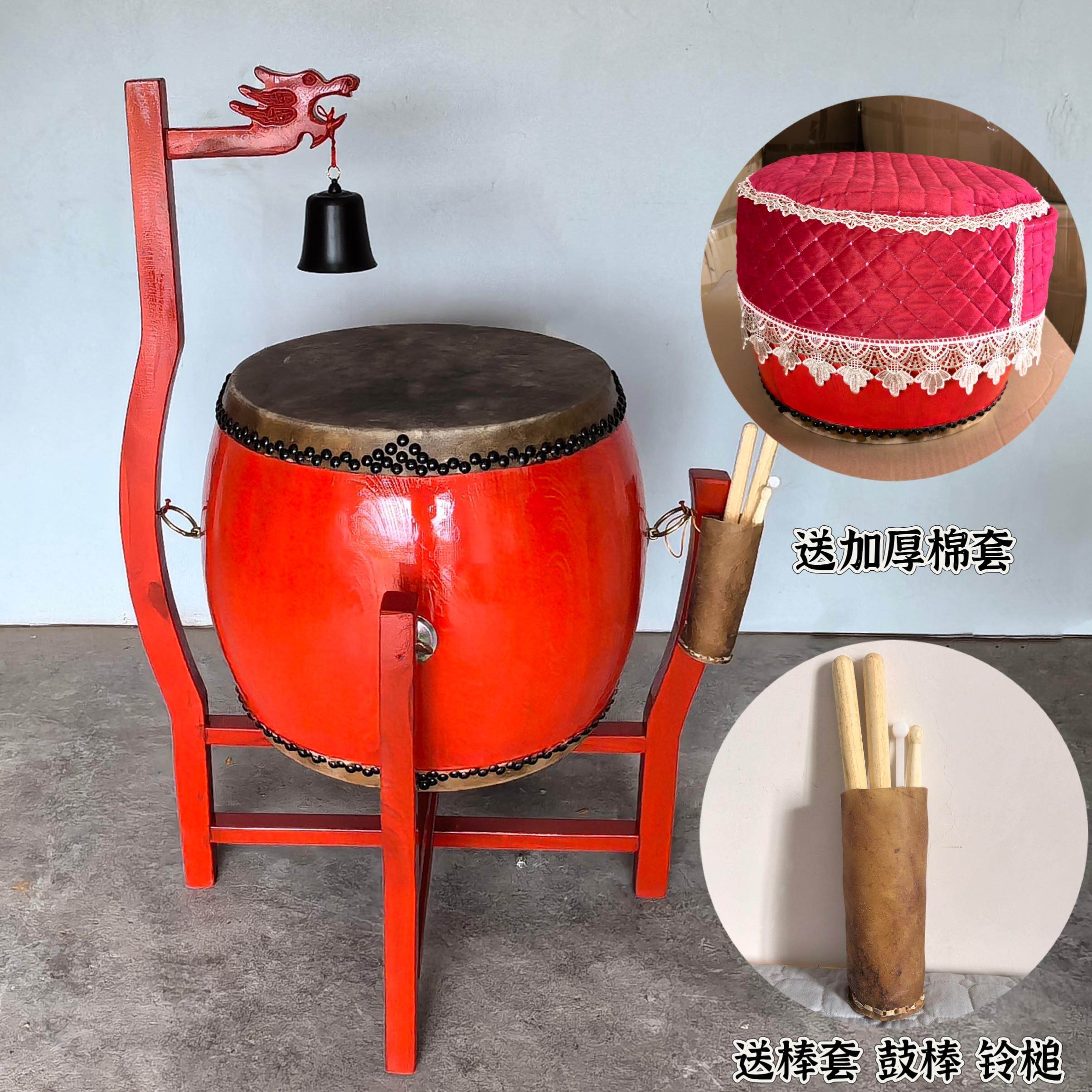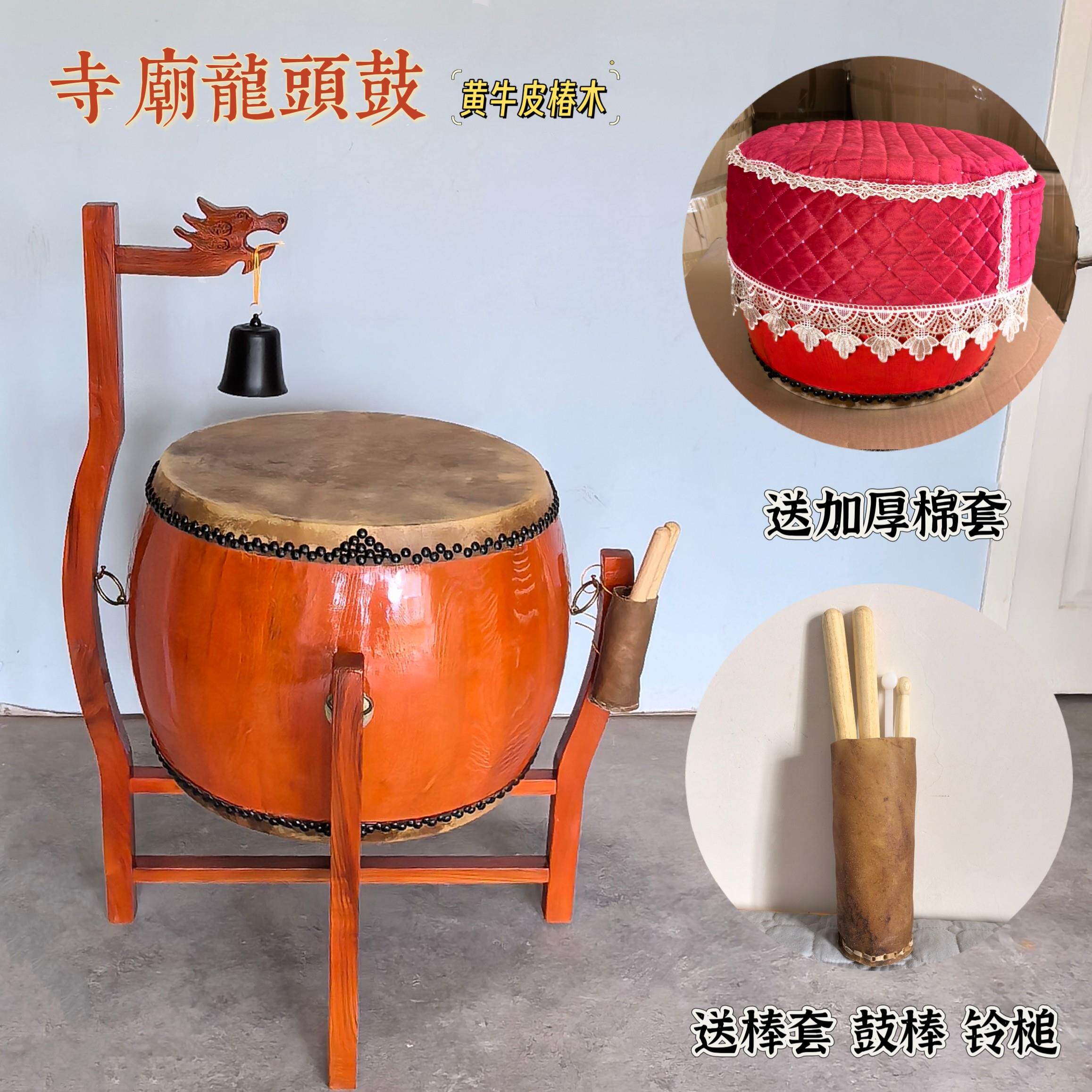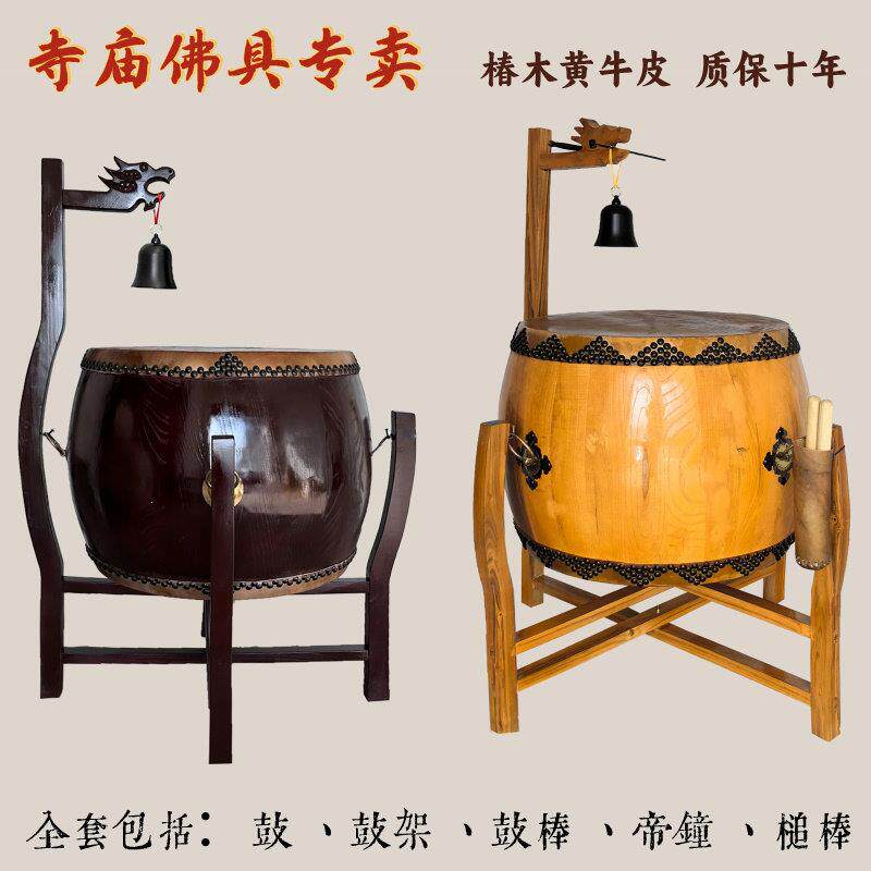 📚 寺庙用鼓椿木黄牛皮铃钟鼓道场法器带帝钟实木鼓架诵经鼓佛具用品