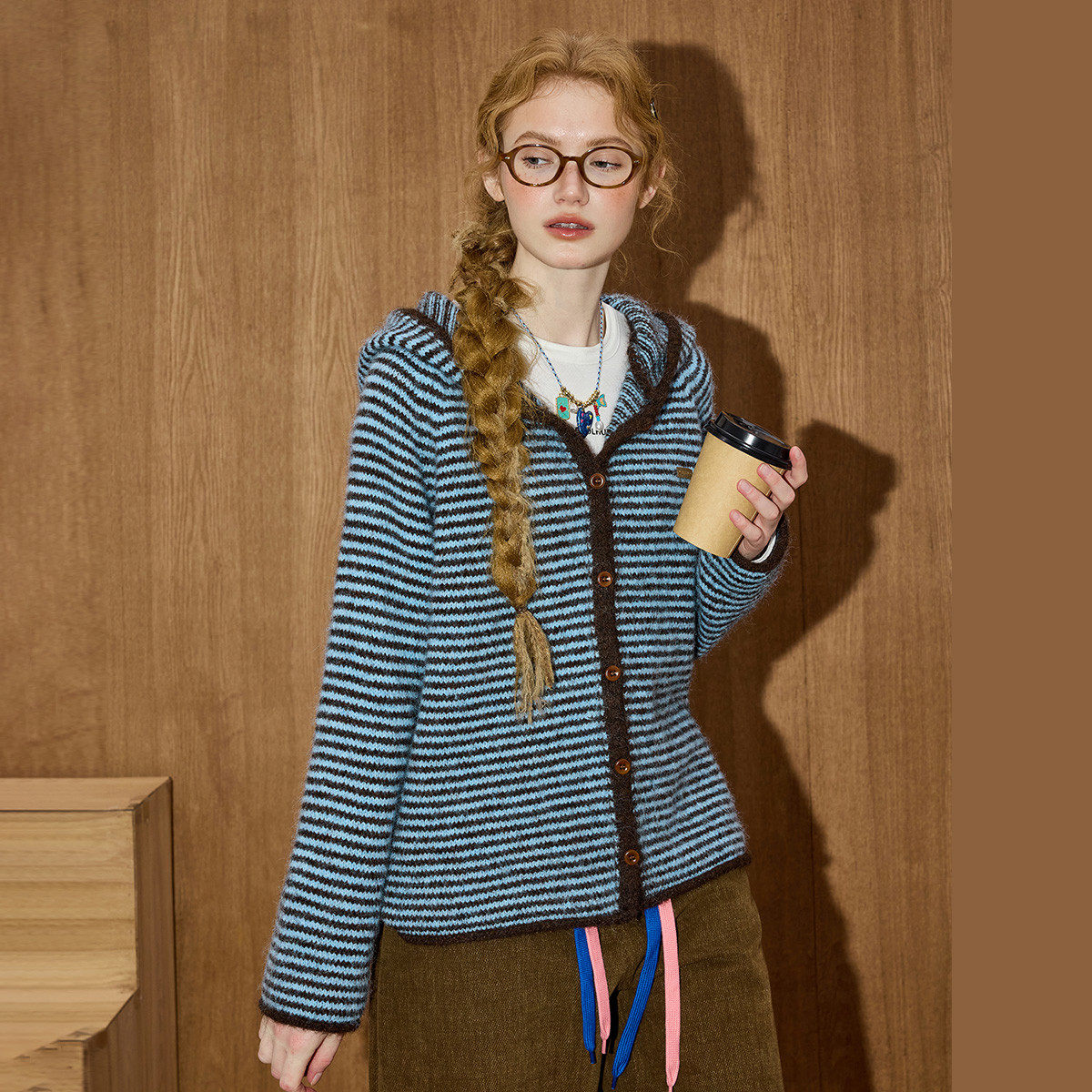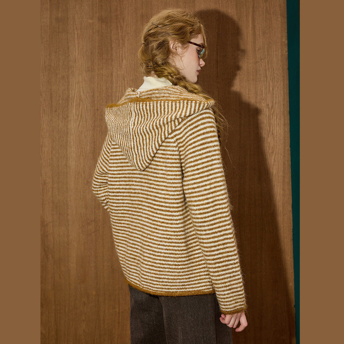 📚 coolhut韩系复古多色条纹连帽针织开衫软糯单排扣冬季女毛衣外套
