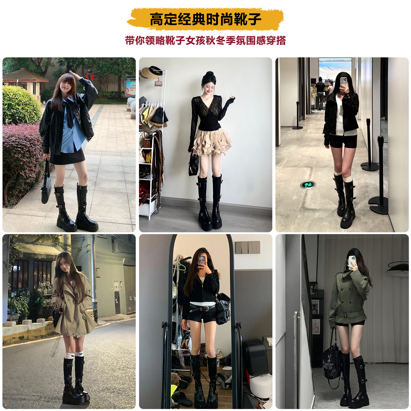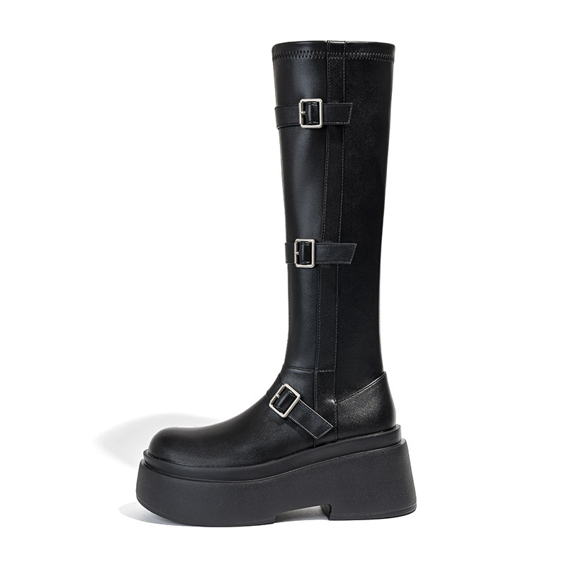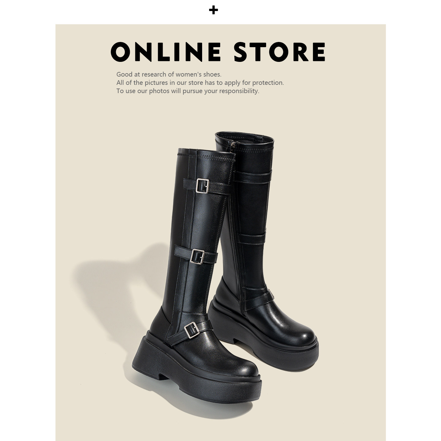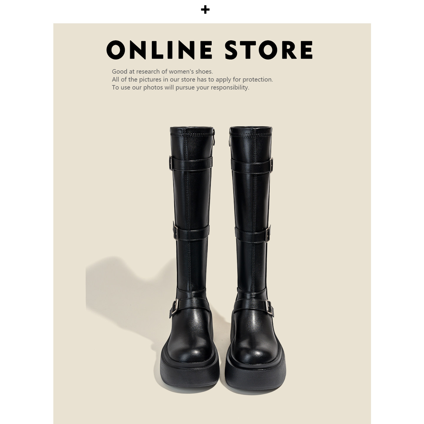 📚 老师傅手工定制真皮厚底长筒靴女皮带扣增高弹力瘦瘦靴高筒骑士靴