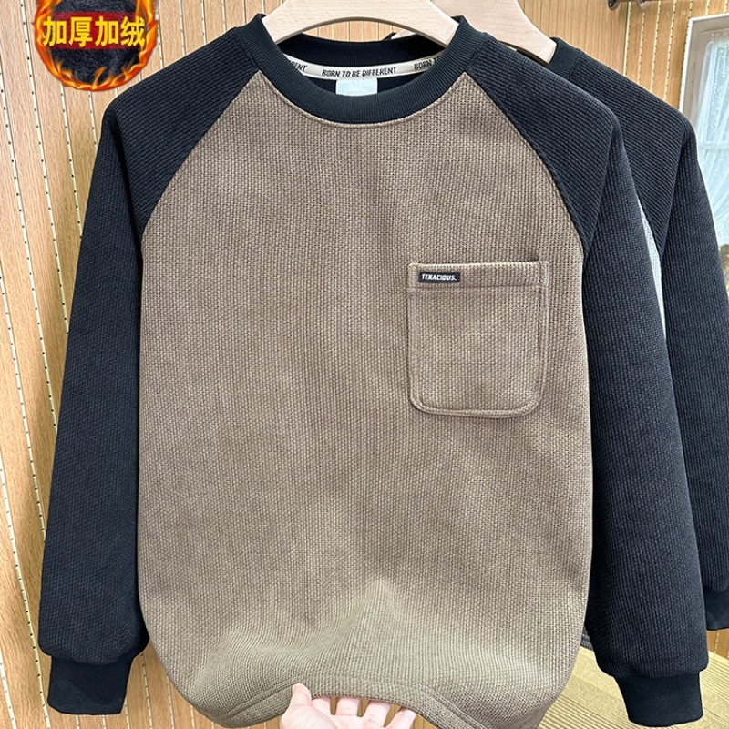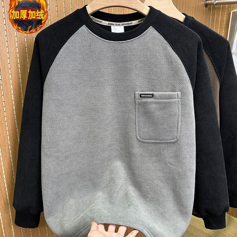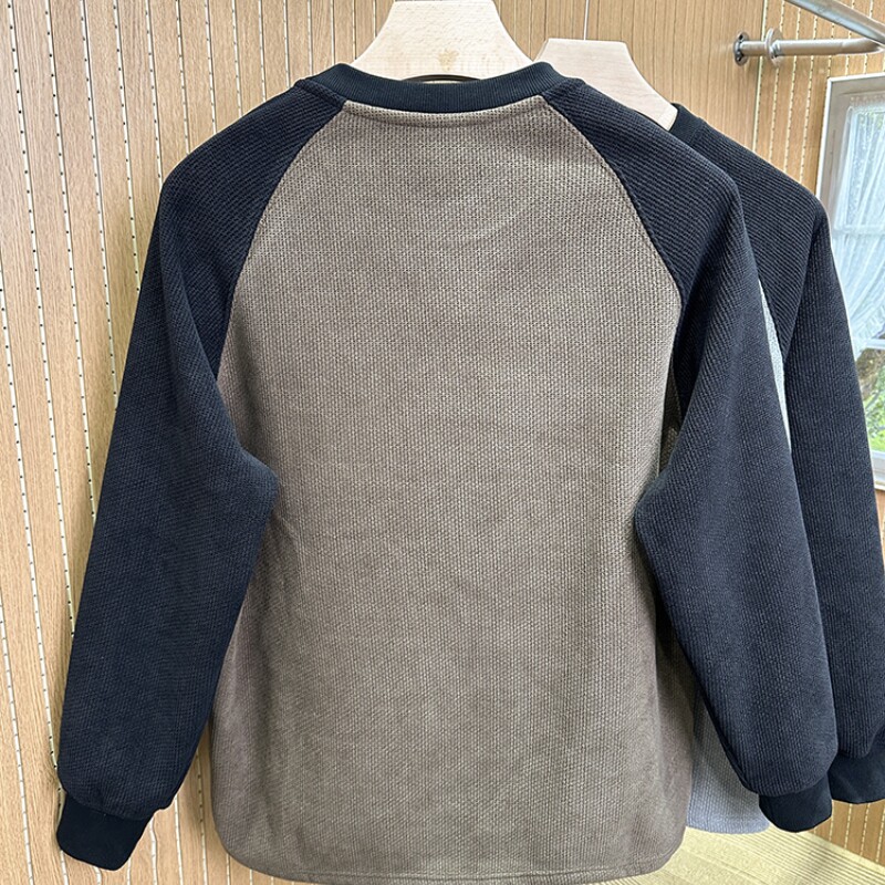 📚 美式冬季重磅菠萝格美式复古撞色拼接套头衫加绒加厚圆领卫衣男潮