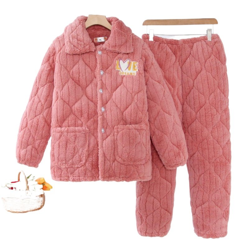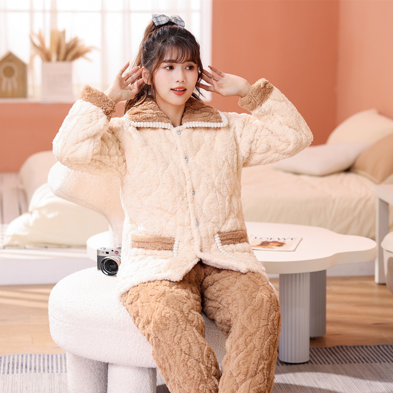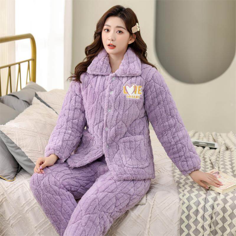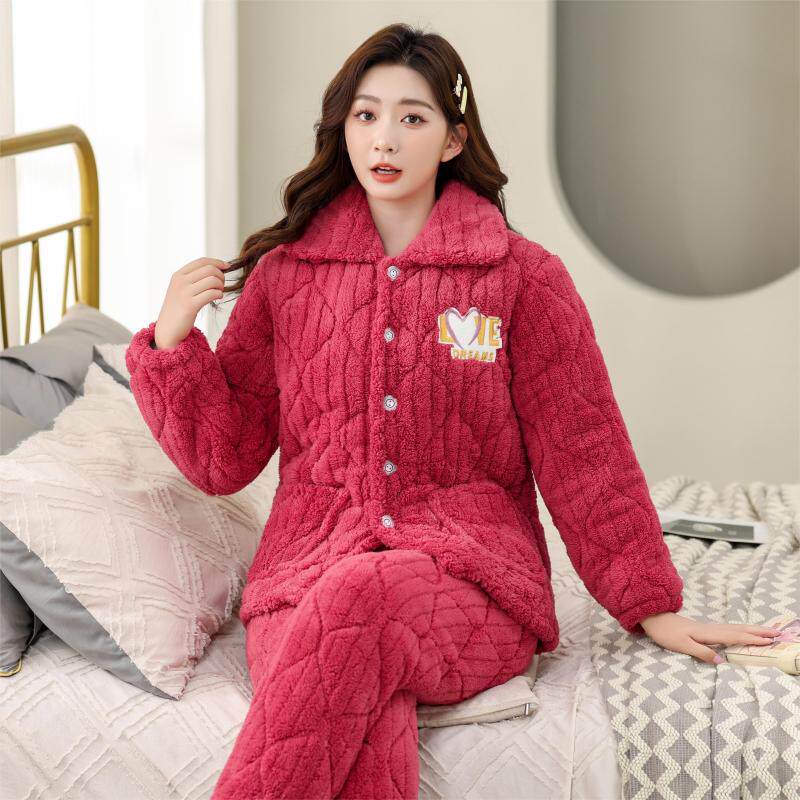 📚 新款睡衣女时尚提花绒外穿冬季三层加厚夹棉法兰绒棉袄保暖家居服