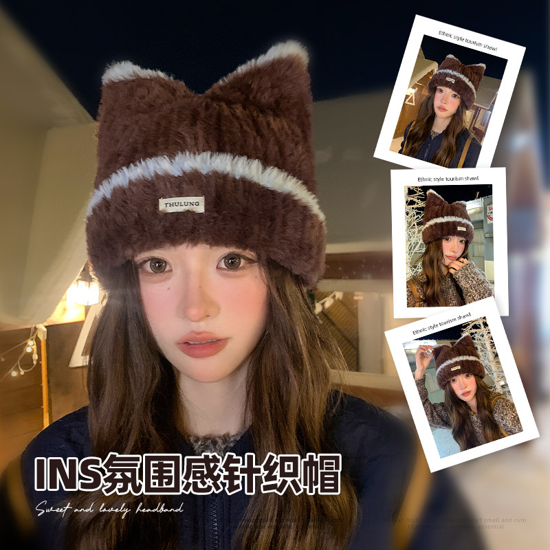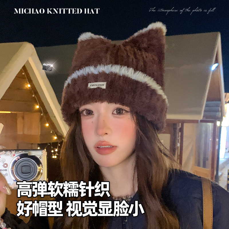 📚 可爱猫耳朵帽子女毛绒绒针织帽2025新款护耳冷帽显脸小毛线帽百搭