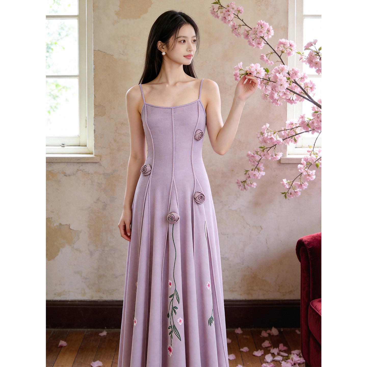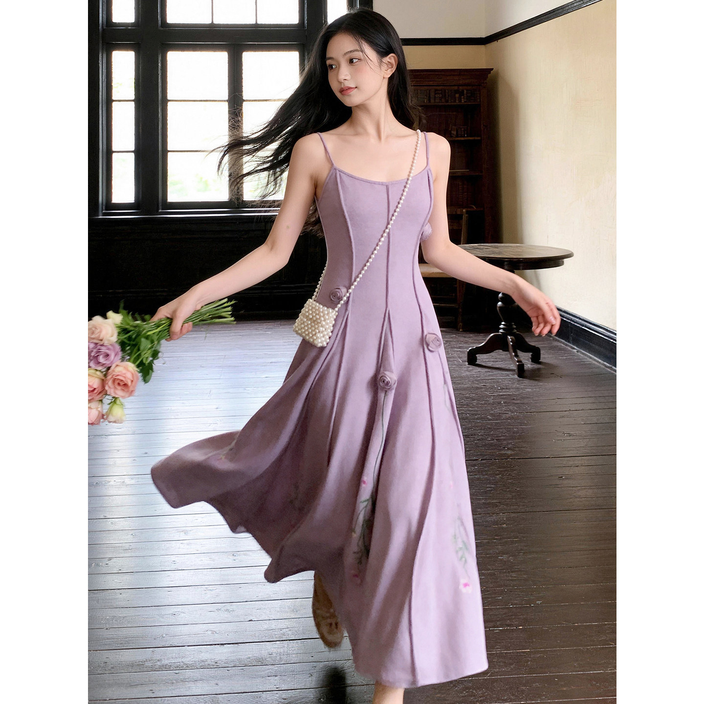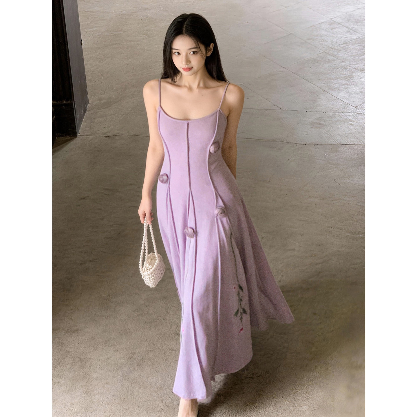 📚 新花满园|春夏紫色立体玫瑰刺绣花朵针织吊带温柔中式修身连衣裙
