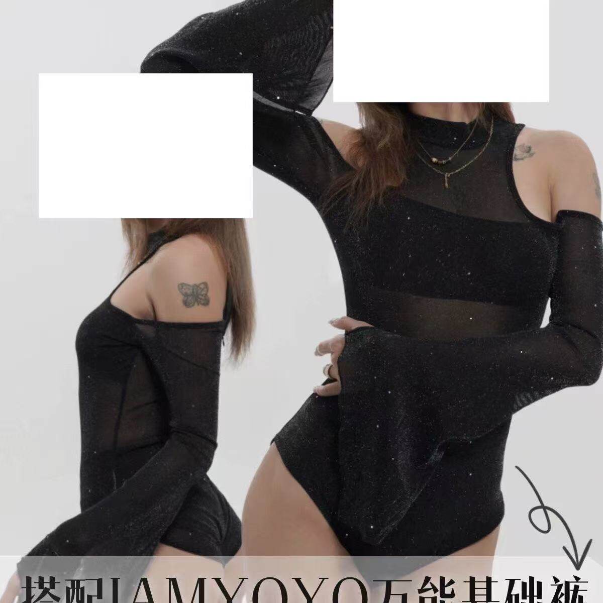 📚 黑暗荣耀连体衣超长袖细闪露肩黑丝上衣heels显腿长舞蹈穿