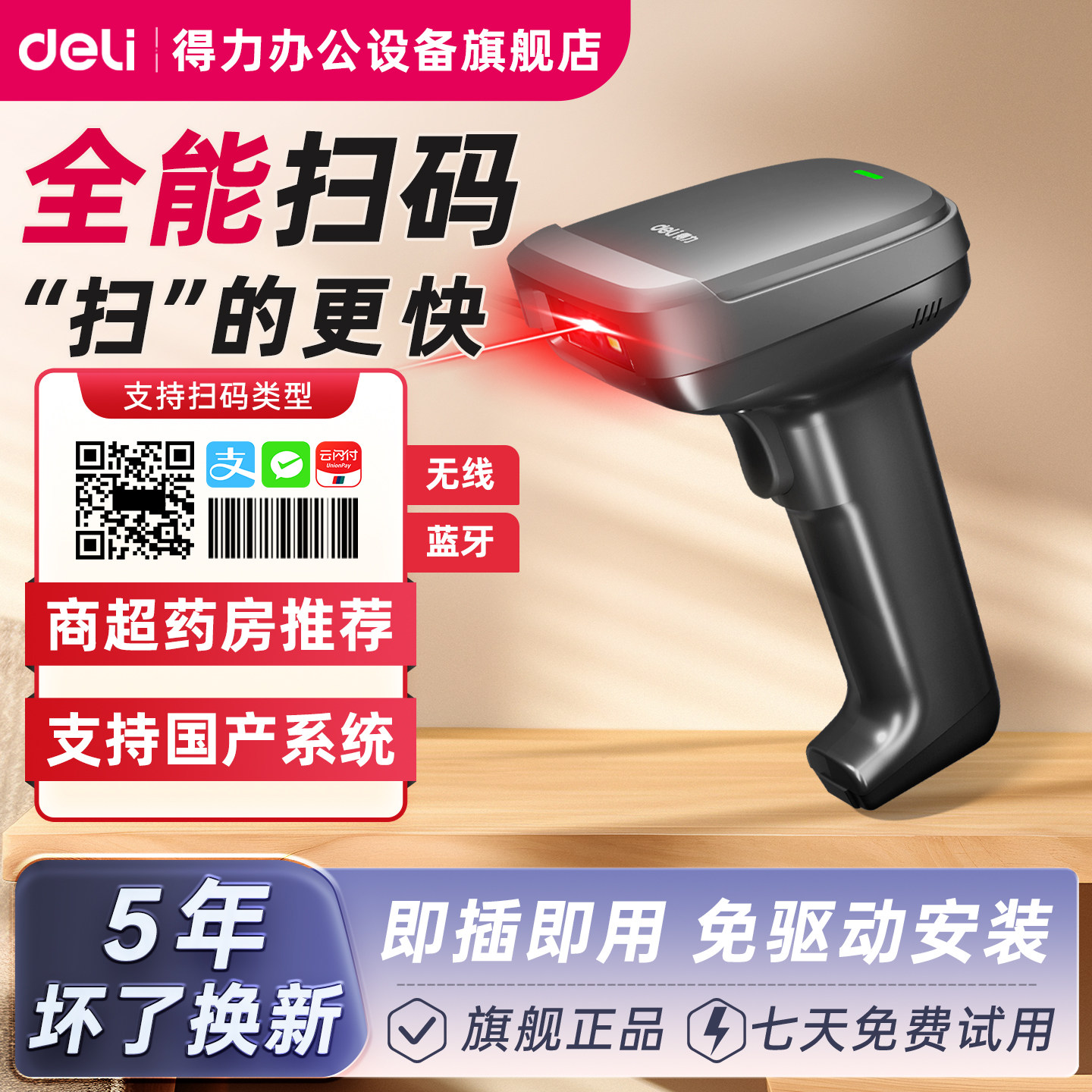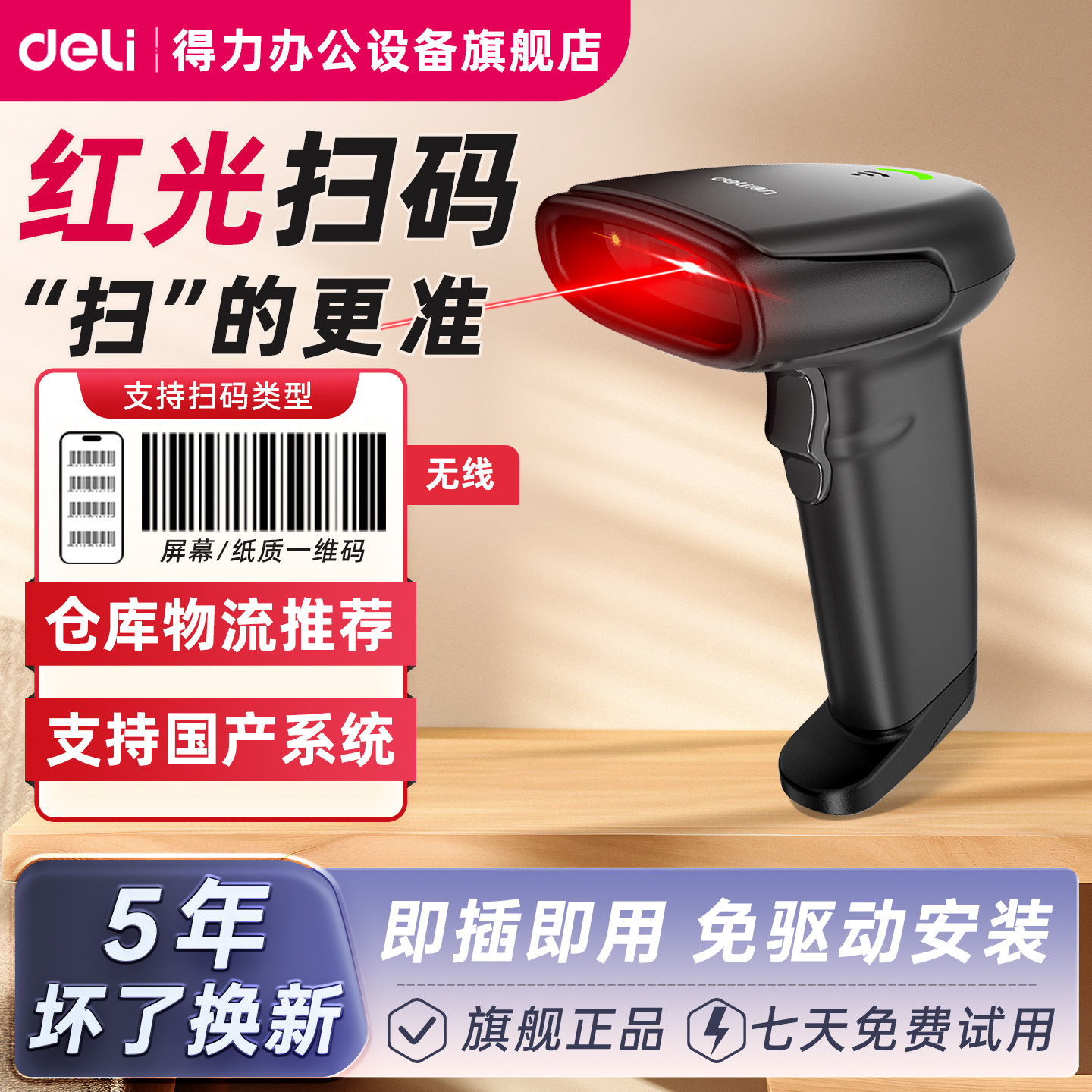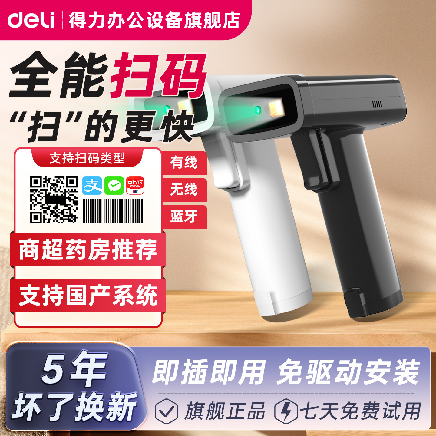 📚 得力扫码枪14880s一维码二维码条码扫描枪物流快递14881药品溯源码微信支付宝收款仓库出入库扫码枪14952WB