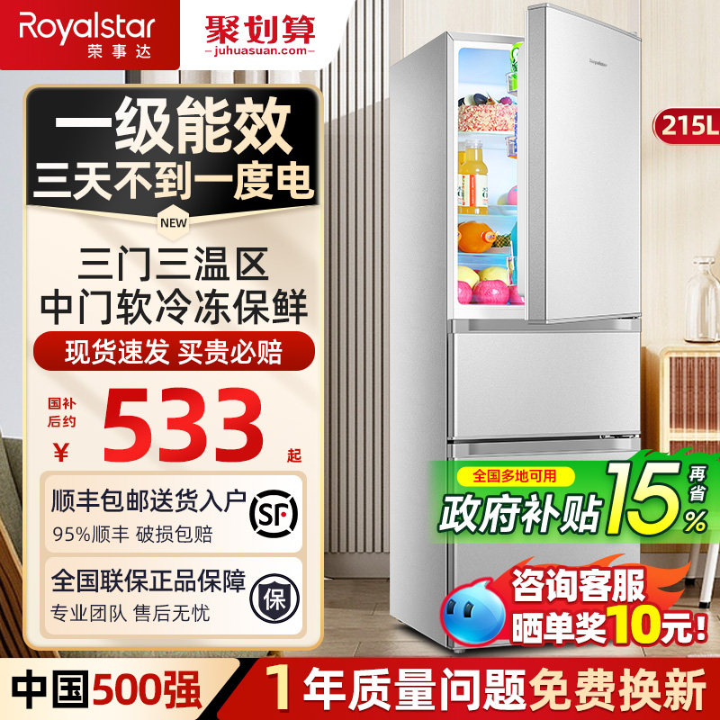 📚 一级能效荣事达215L三门冰箱家用小型出租房节能三开门小户型冰箱
