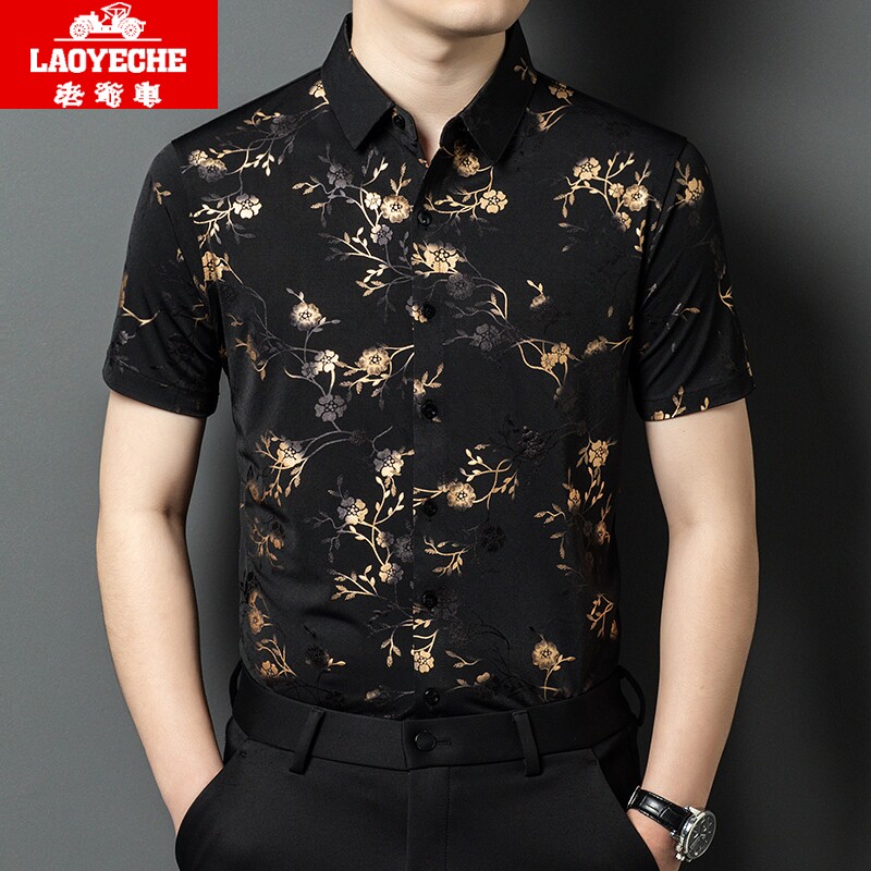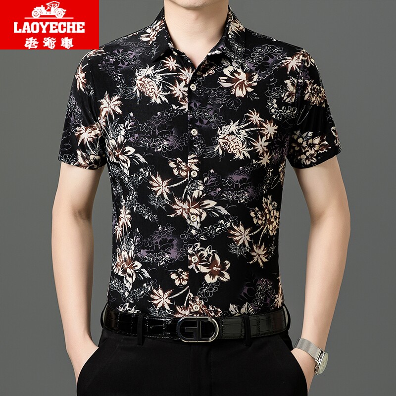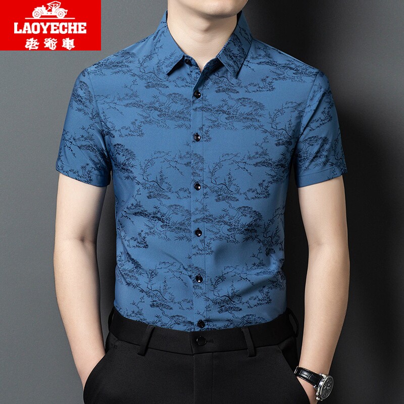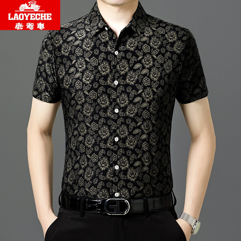 📚 老爷车夏季中年男士冰丝短袖衬衫爸爸装宽松潮流印花半袖休闲衬衣