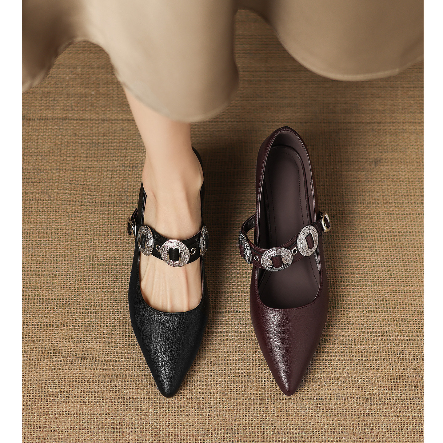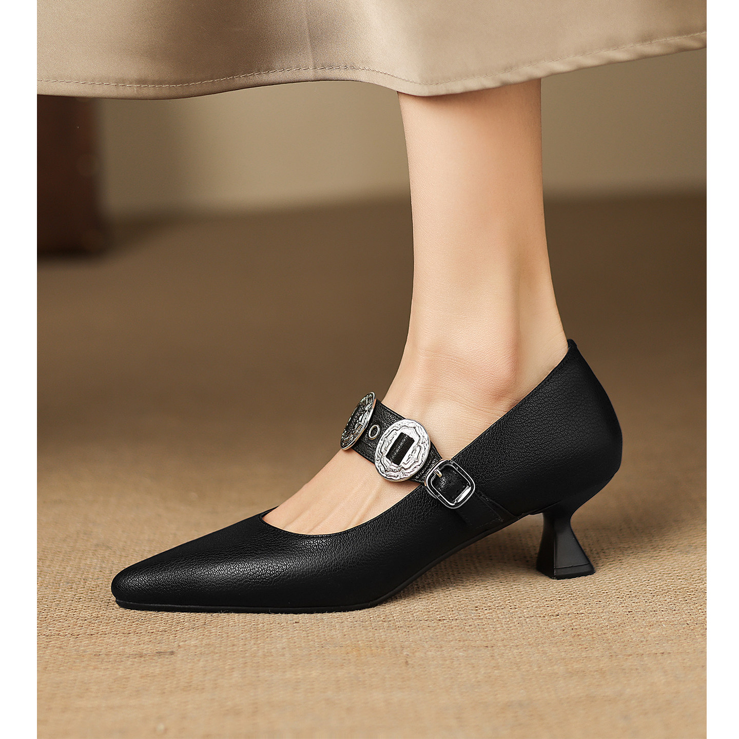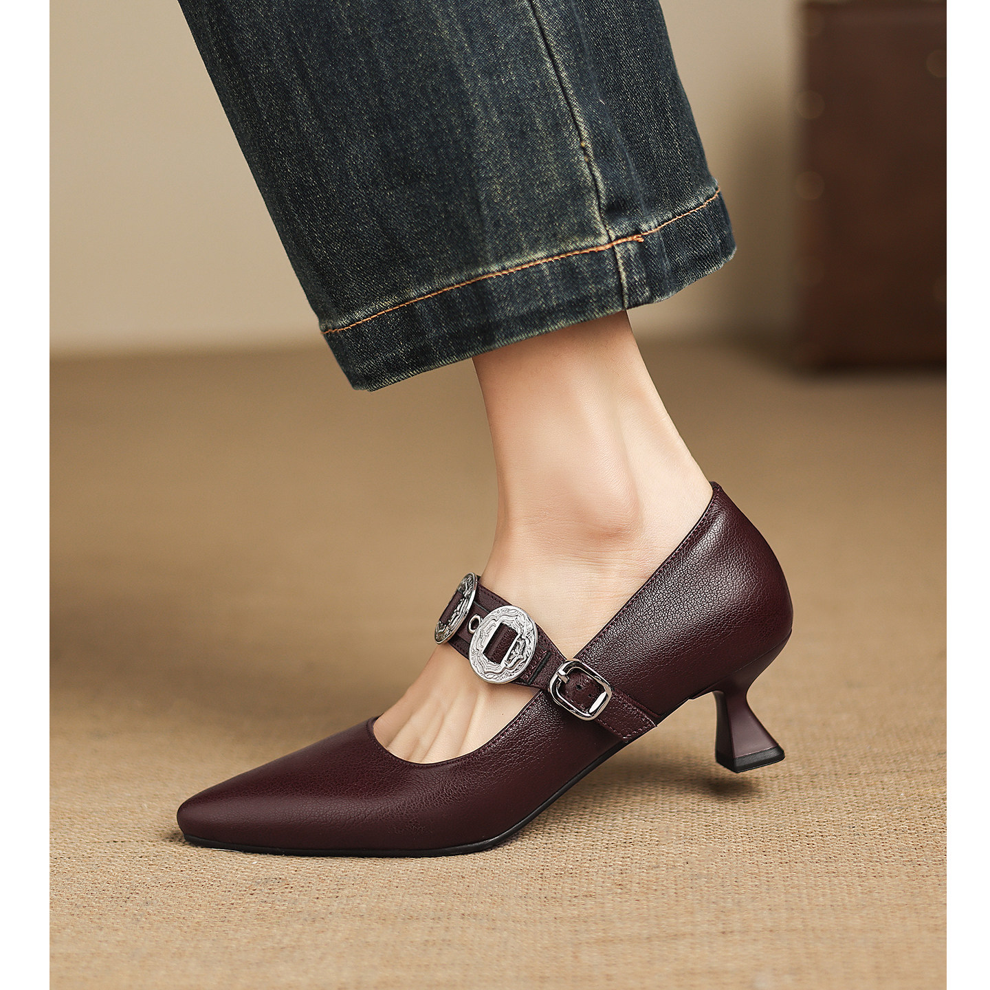 📚 Kmeizu法式优雅~5cm细跟单鞋女春尖头铆钉钻扣一字带玛丽珍高跟鞋