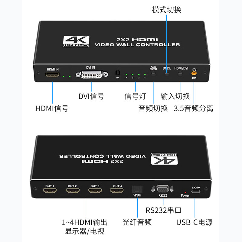 📚 睿稳HDMI无缝拼接器一进四出分屏显示器2X2四口户外广告机视频拼接器多屏宝U盘4K高清视频自动巡环播放器30Hz