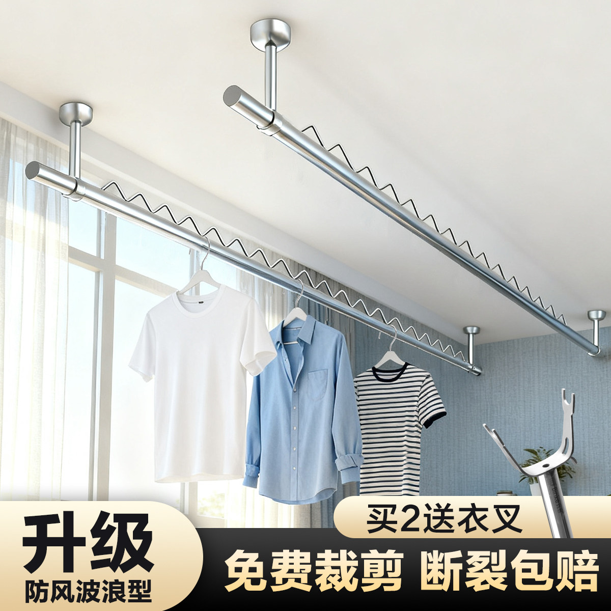 📚 不锈钢防风晾衣杆阳台固定式一整根晒衣杆家用顶装波浪型晾衣架