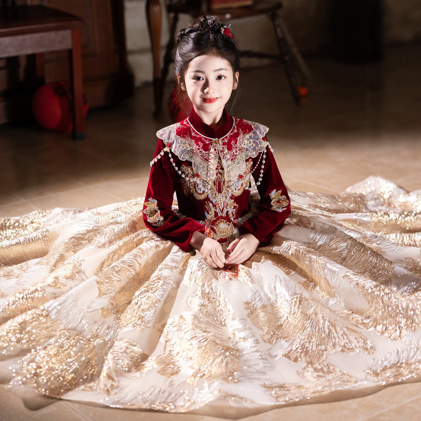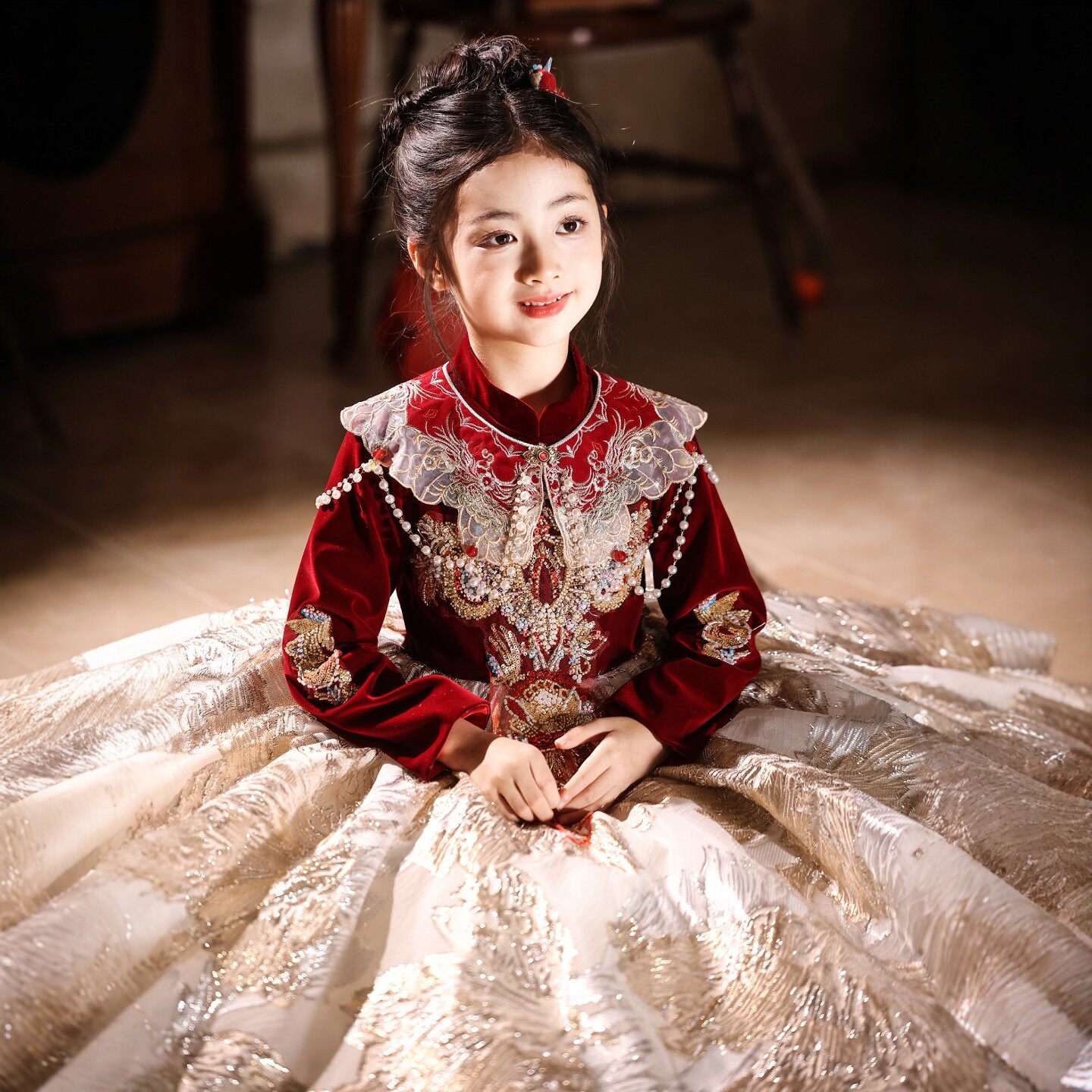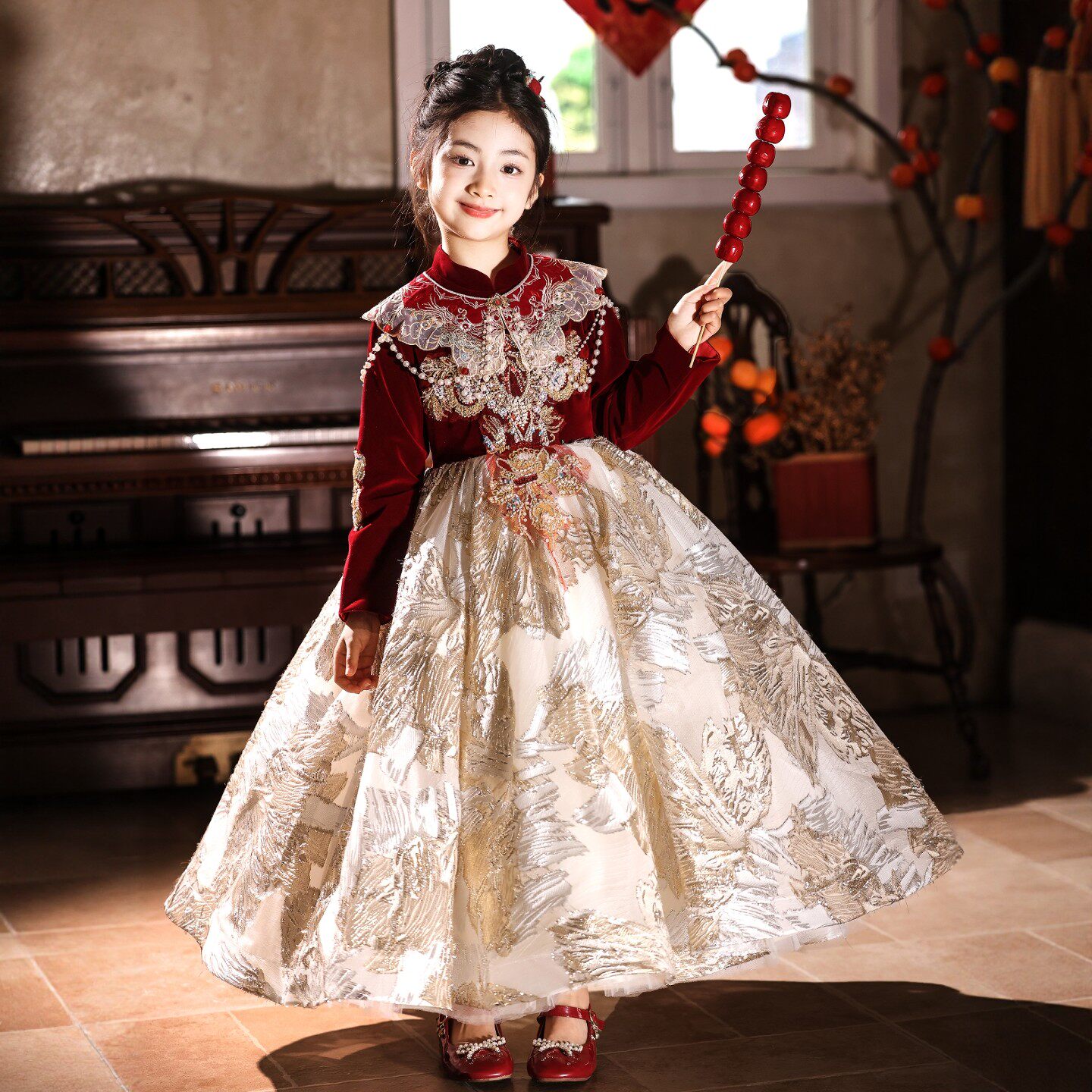 📚 女童礼服红色新中式儿童生日公主裙小女孩主持人钢琴新年演出服冬