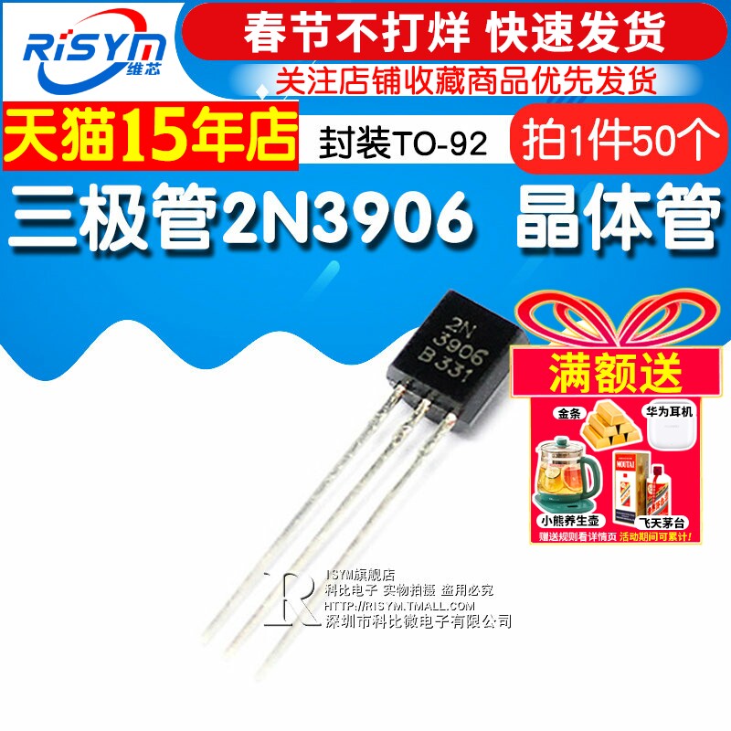📚 Risym 三极管 2N3906 3906 小功率晶体管 PNP 插件TO-92 50只