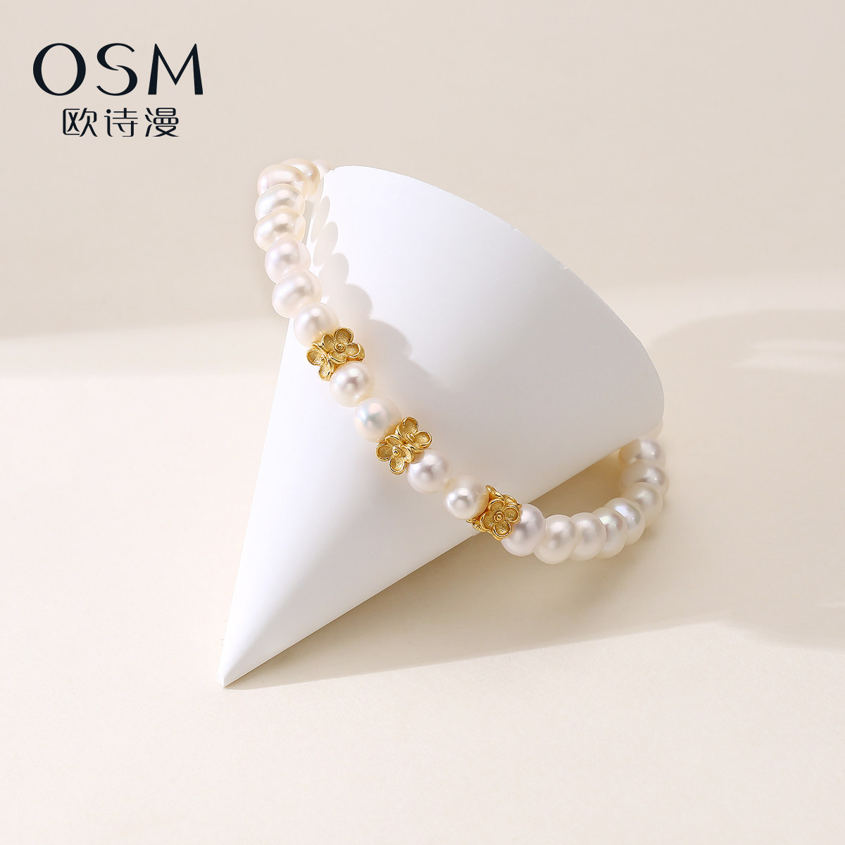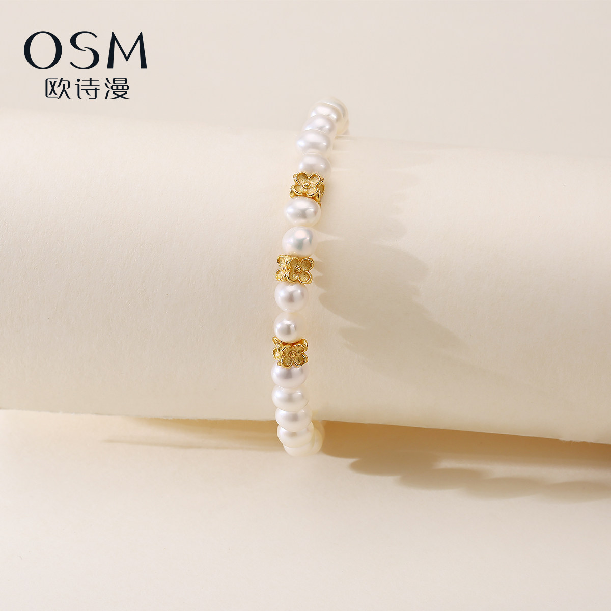 📚 欧诗漫珠宝近圆淡水珍珠手链金色花朵配件弹力绳手串女925银金粟