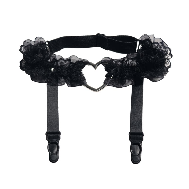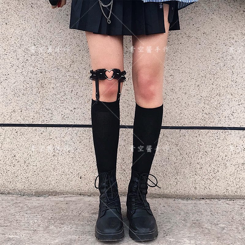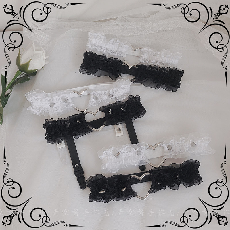 📚 青空酱 手作少女黑色铆钉弹力y2k腿环 蕾丝花边爱心袜夹吊带绑带