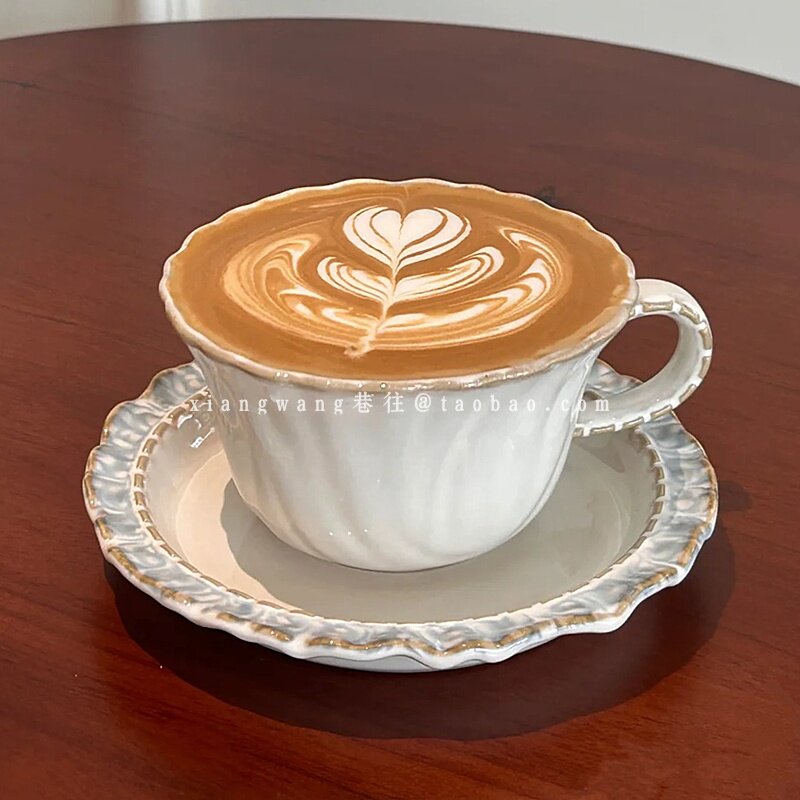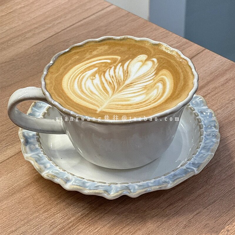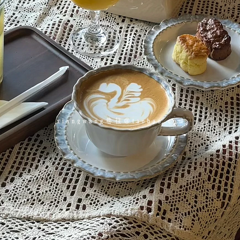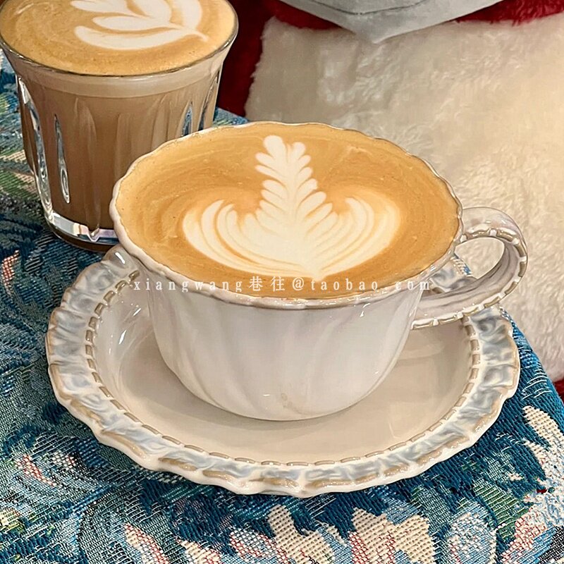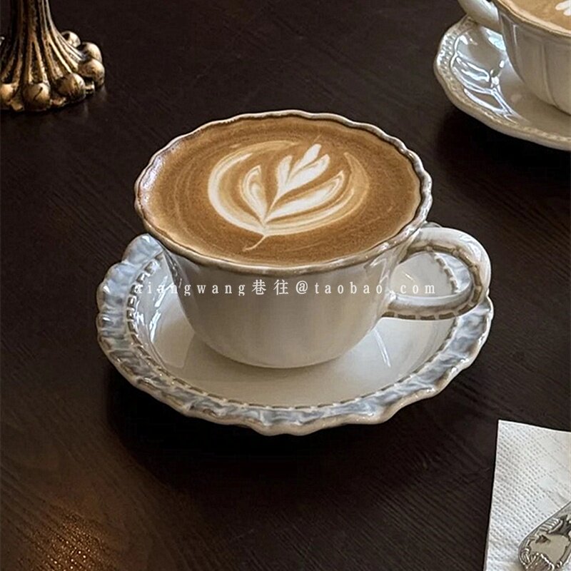 📚 中古宫廷风烟火蓝系咖啡杯碟高颜值精致浮雕裙边拿铁拉花陶瓷杯碟