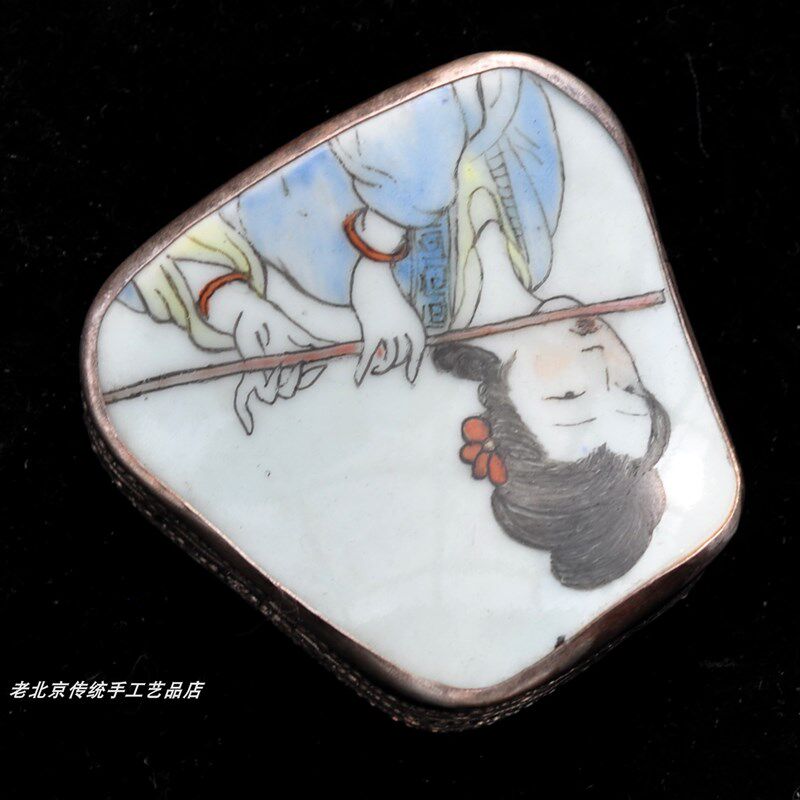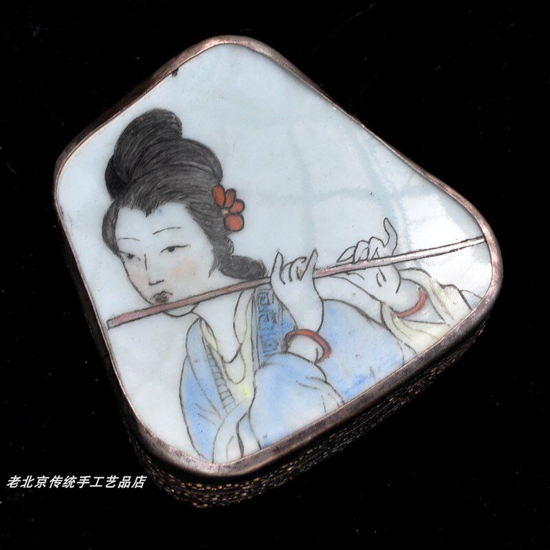 📚 老瓷片盒银锭盒元宝盒p胭脂盒首饰盒手工錾刻德银仕女图手工艺老