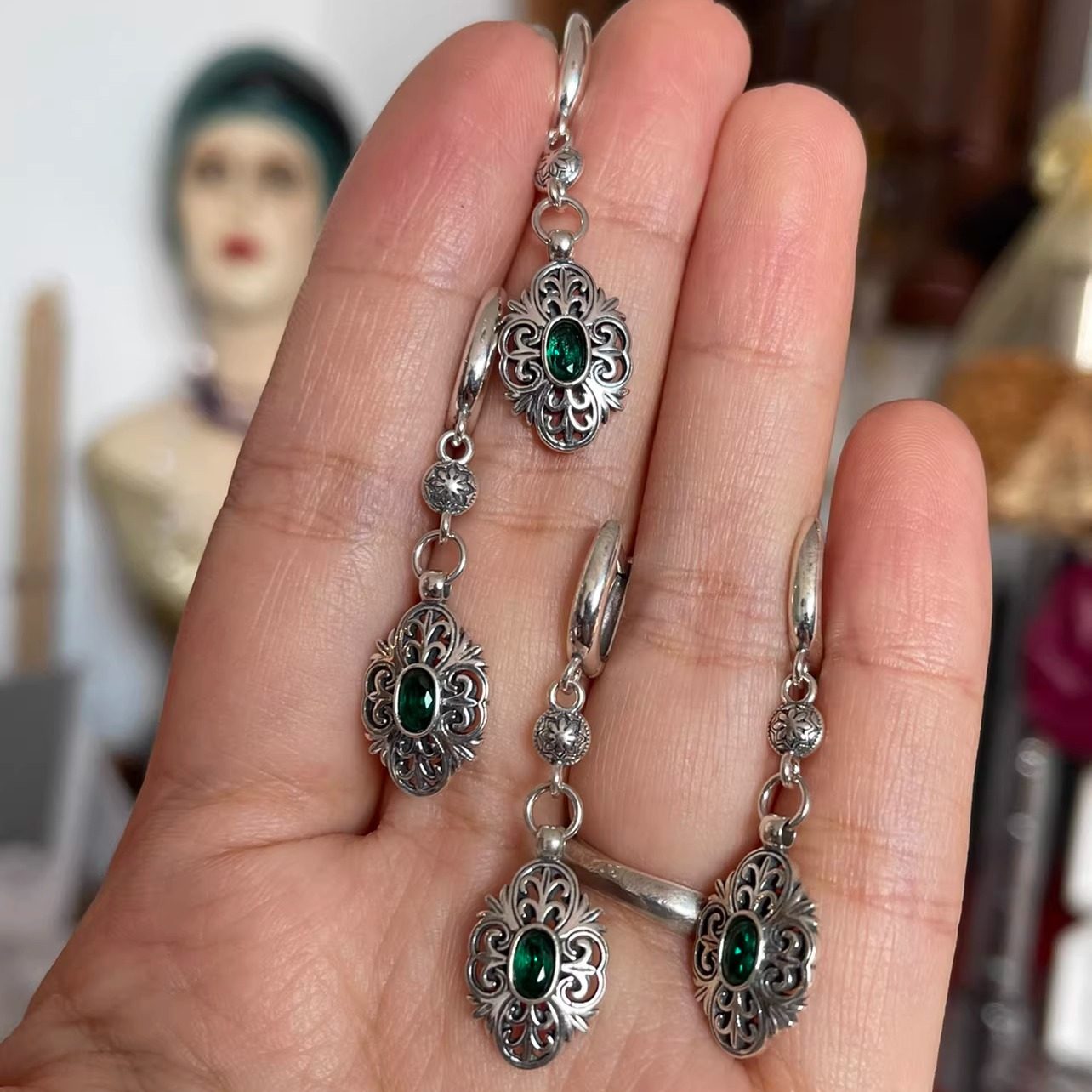 #土耳其古董 #雕镂卷草纹 #礼物套装 #925银 #祖母绿色幸运红宝吊坠 #券后价119