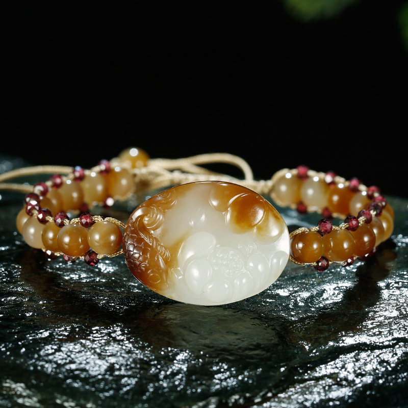 📚 玉说和田玉手链女款糖白玉锦鲤荷花连年有余结艺玉石手串附证书