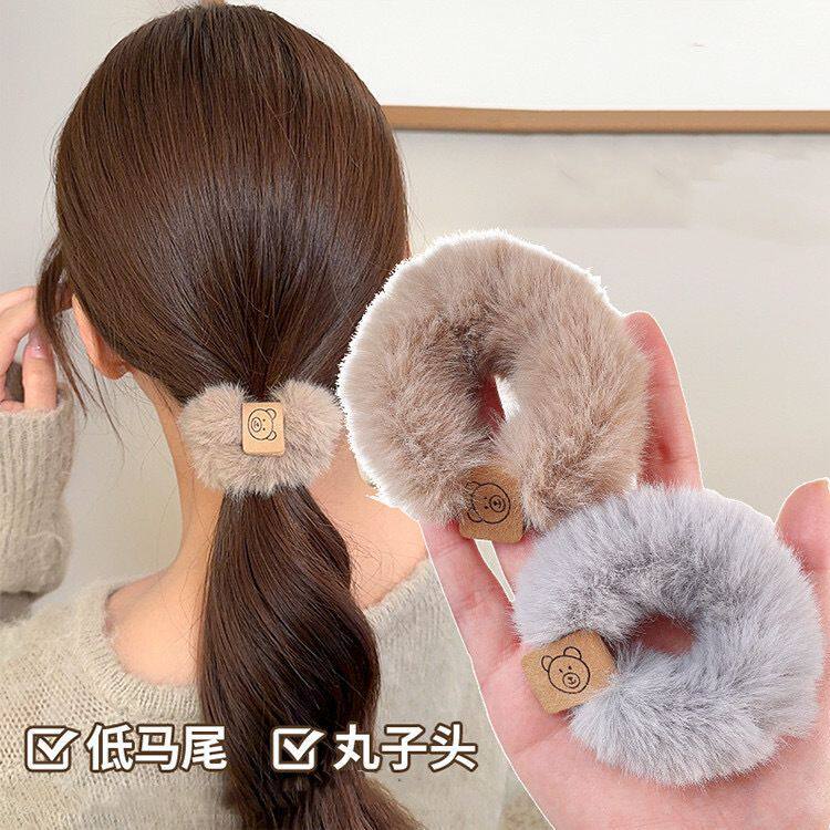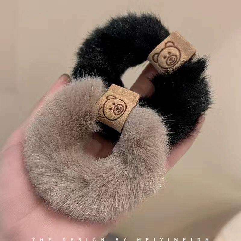 📚 新款高级感扎发皮筋高弹力无痕加粗毛毛皮套小熊标毛绒发圈头绳女