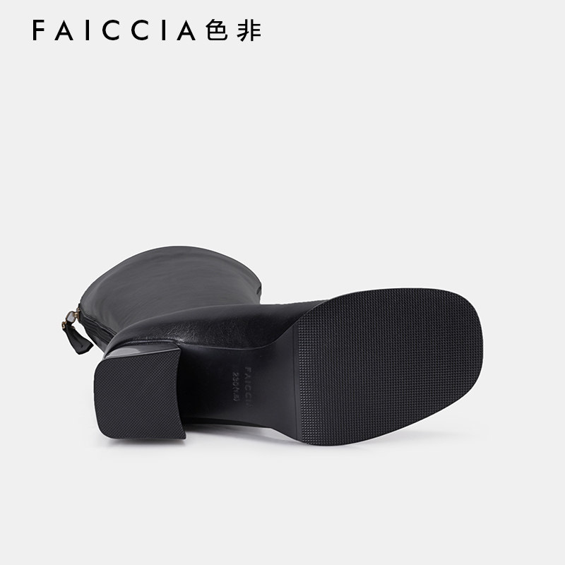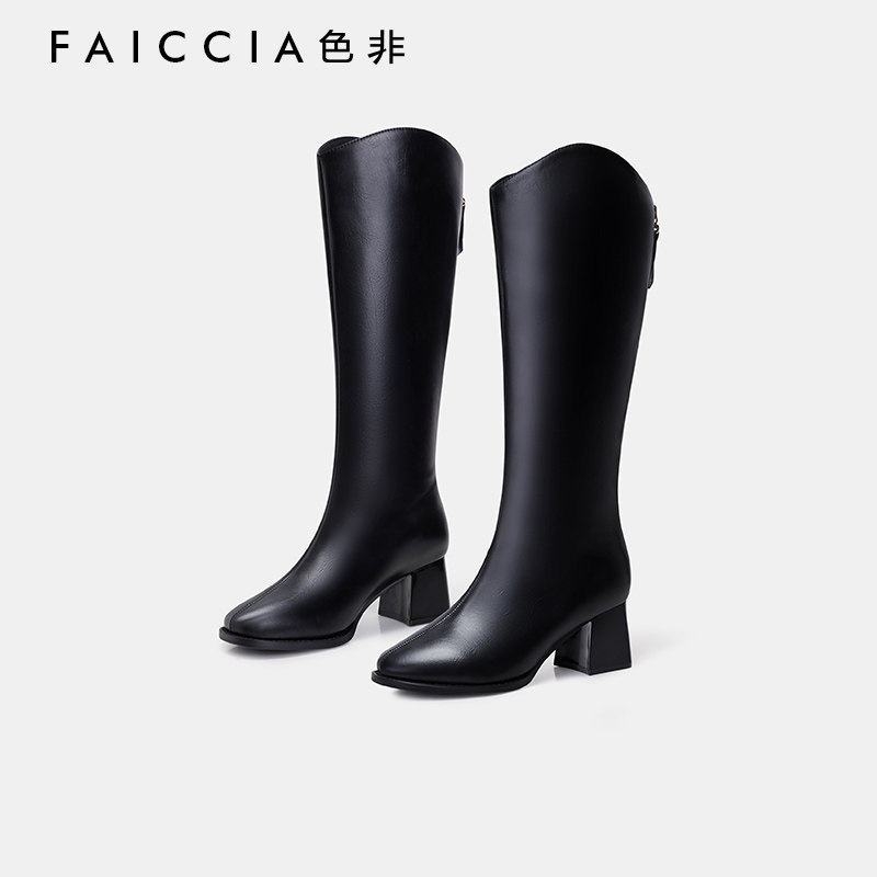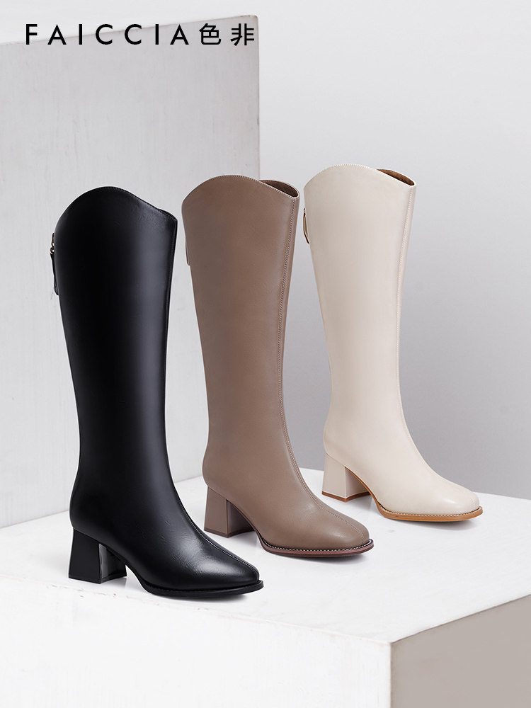 📚 色非秋冬新款方头小个子长统靴黑色高跟粗跟长靴女弹力靴D348