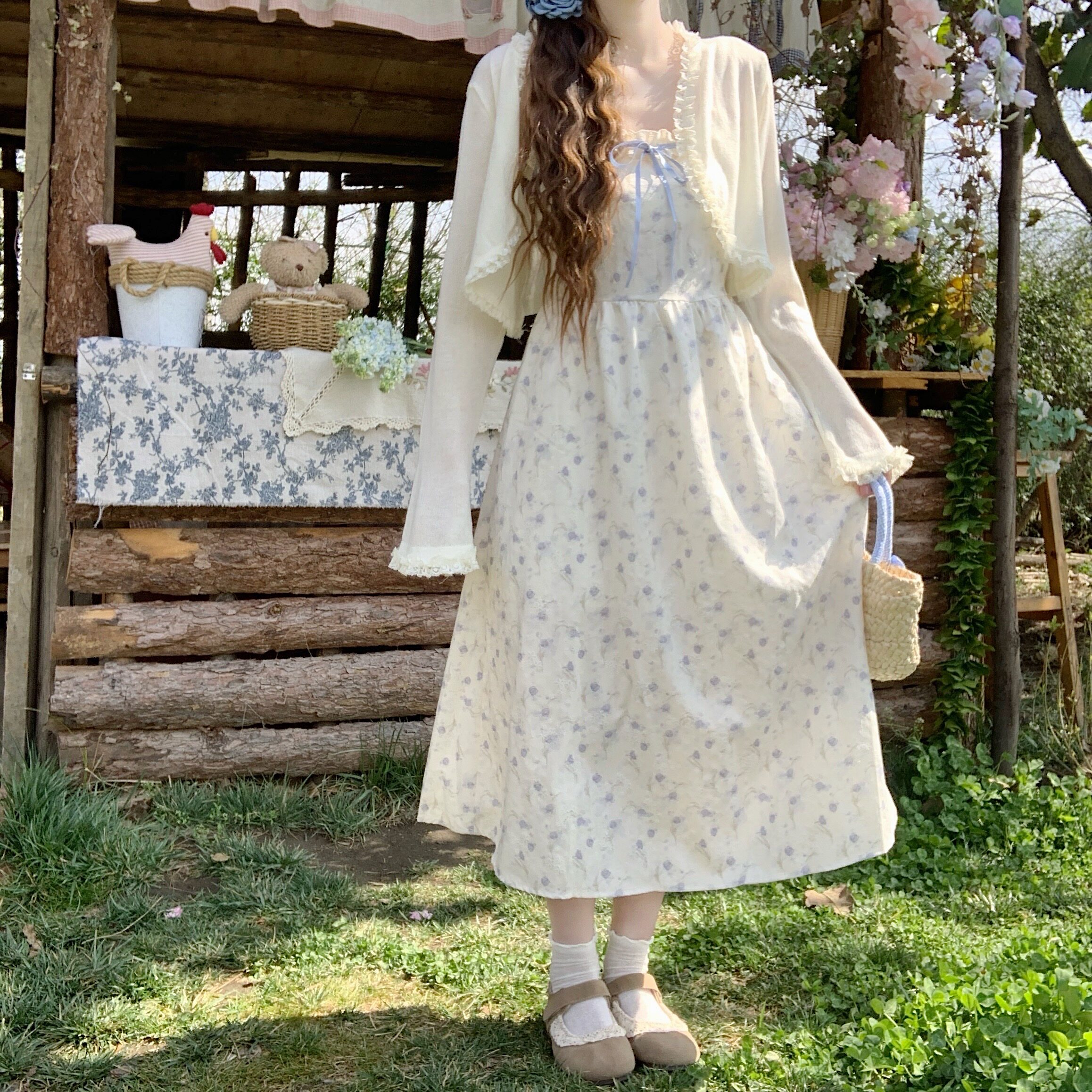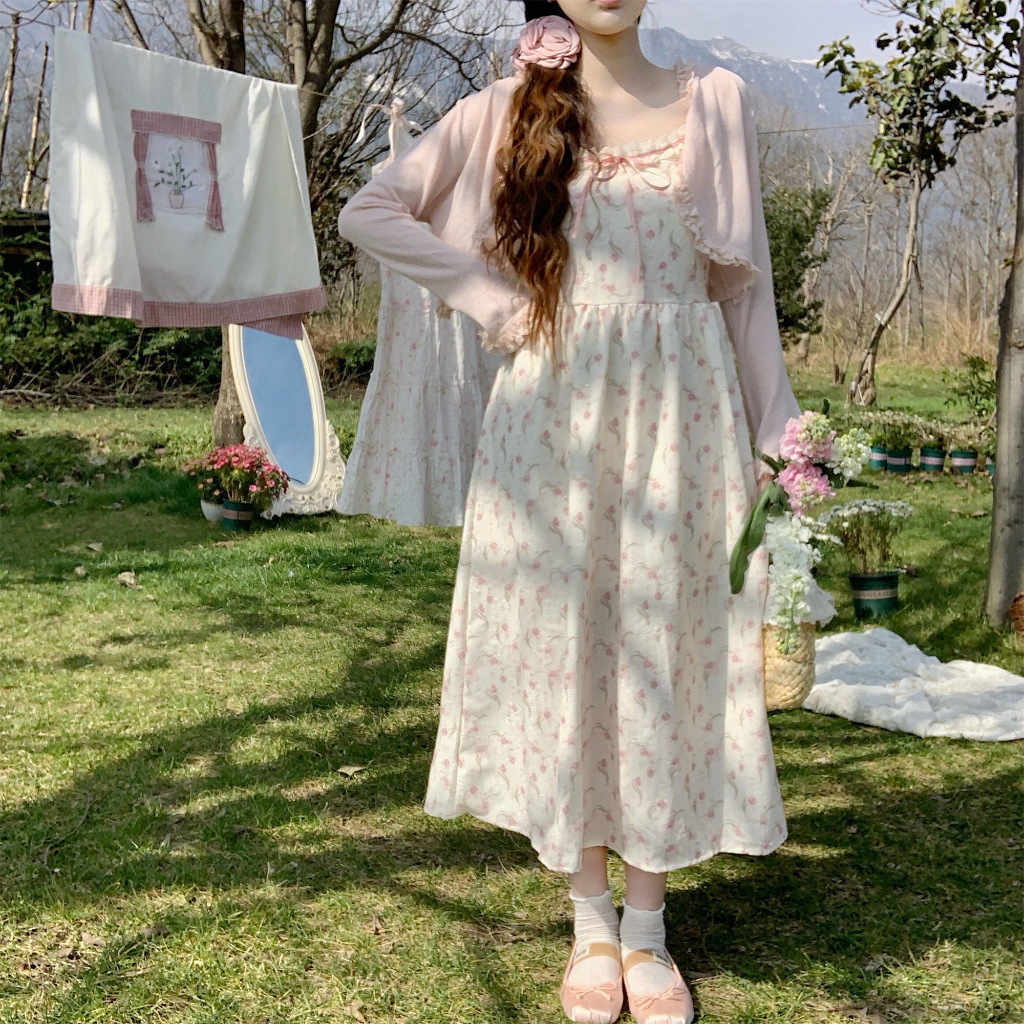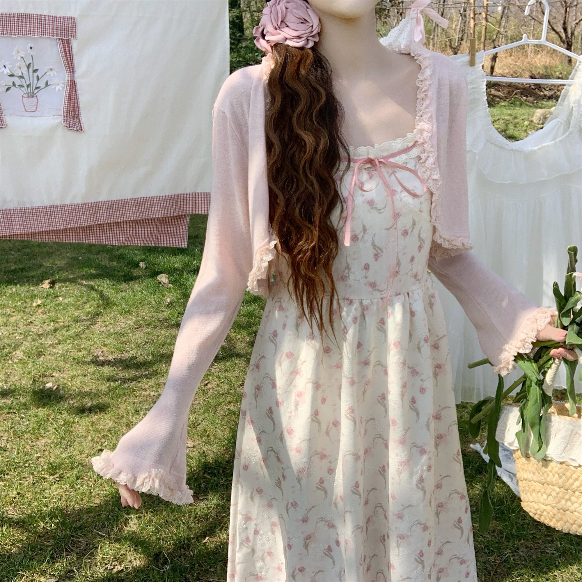 📚 【Dear YN】温柔风 油画玫瑰丝带花边碎花吊带裙收腰中长款连衣裙
