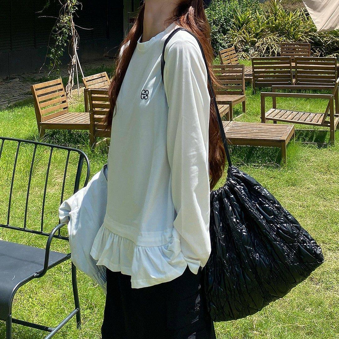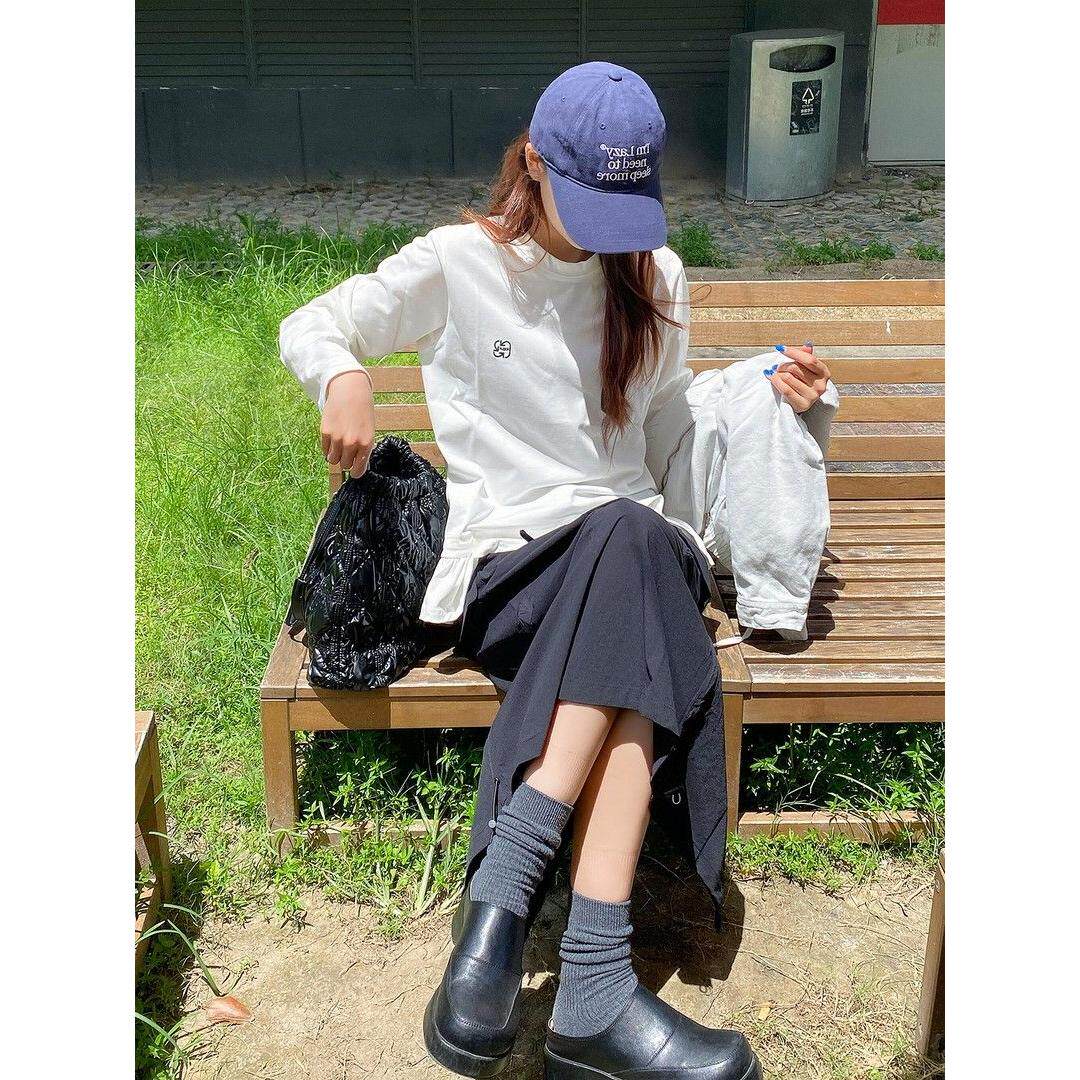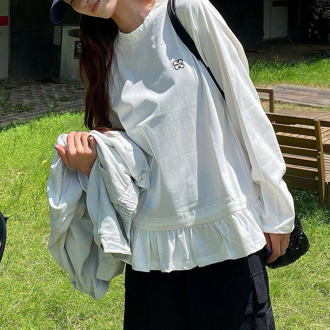 📚 95棉5氨纶学院风白色长袖t恤女早秋春季花边下摆设计感打底衫