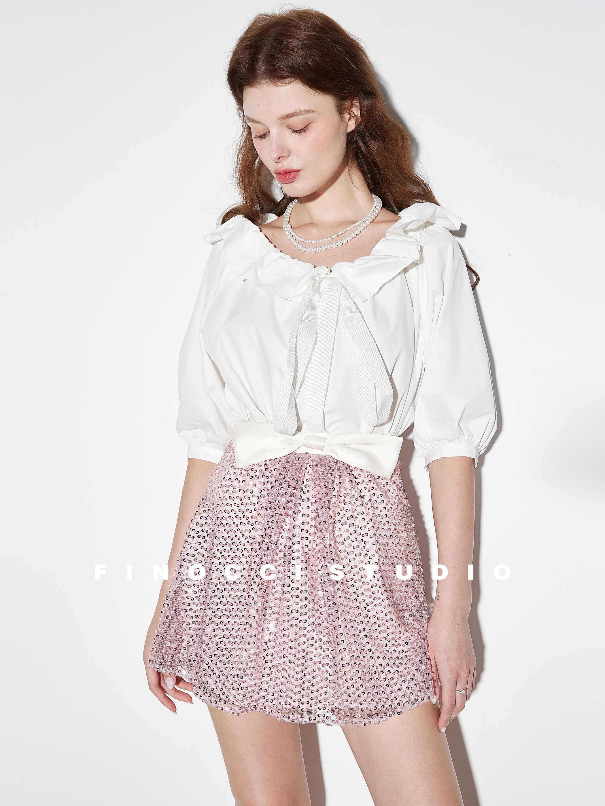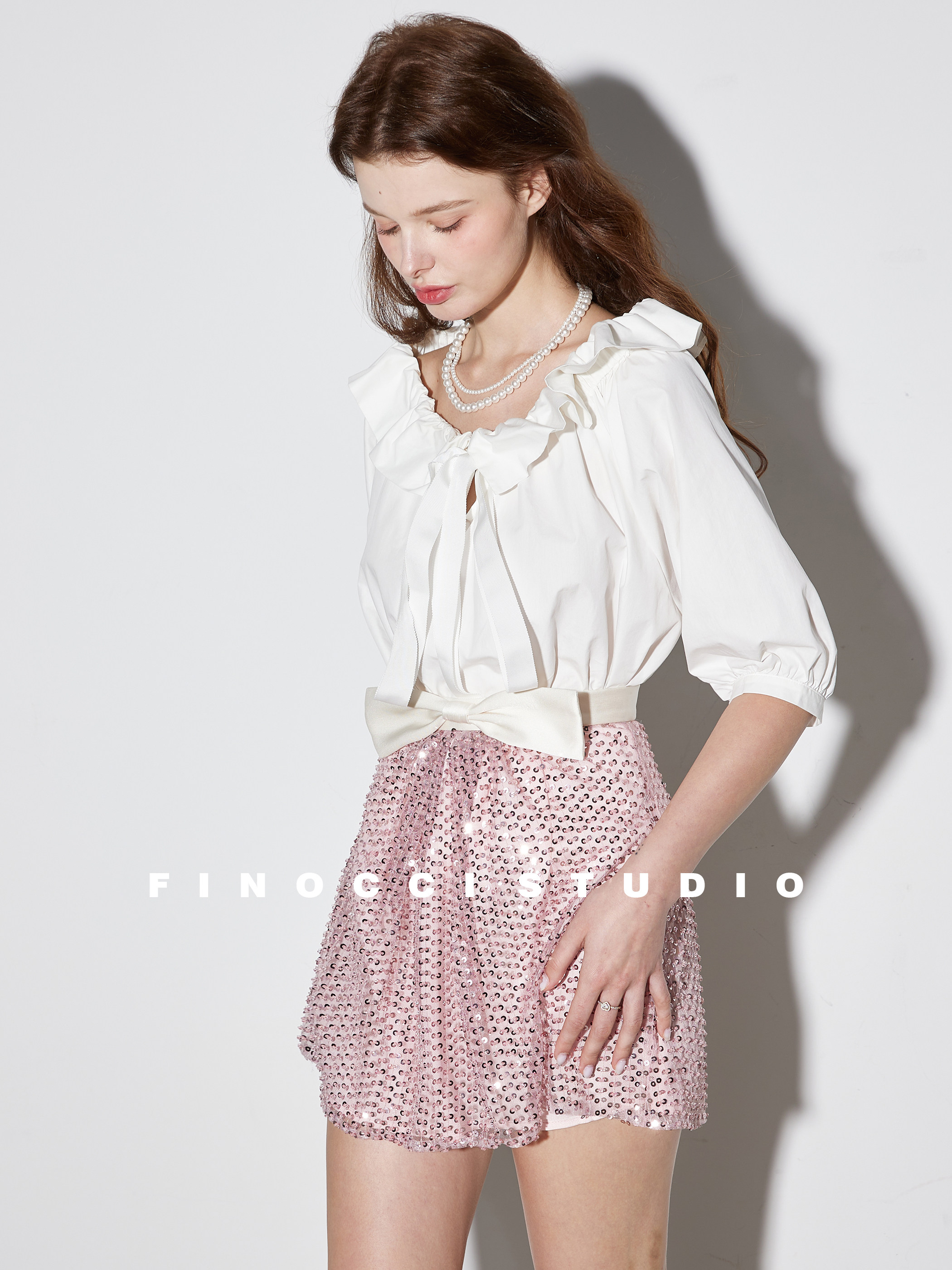 📚 FINOCCI夏 定制重工珠管莹润亮彩网纱蝴蝶结财阀千金精致高端半裙