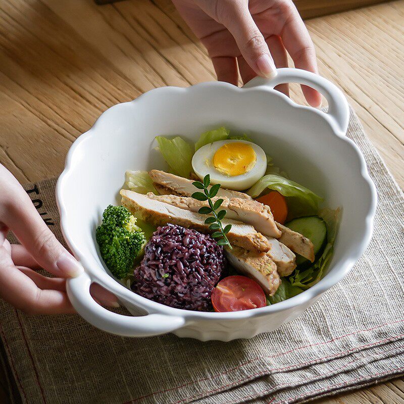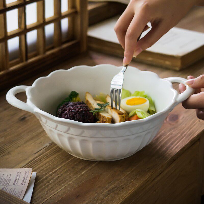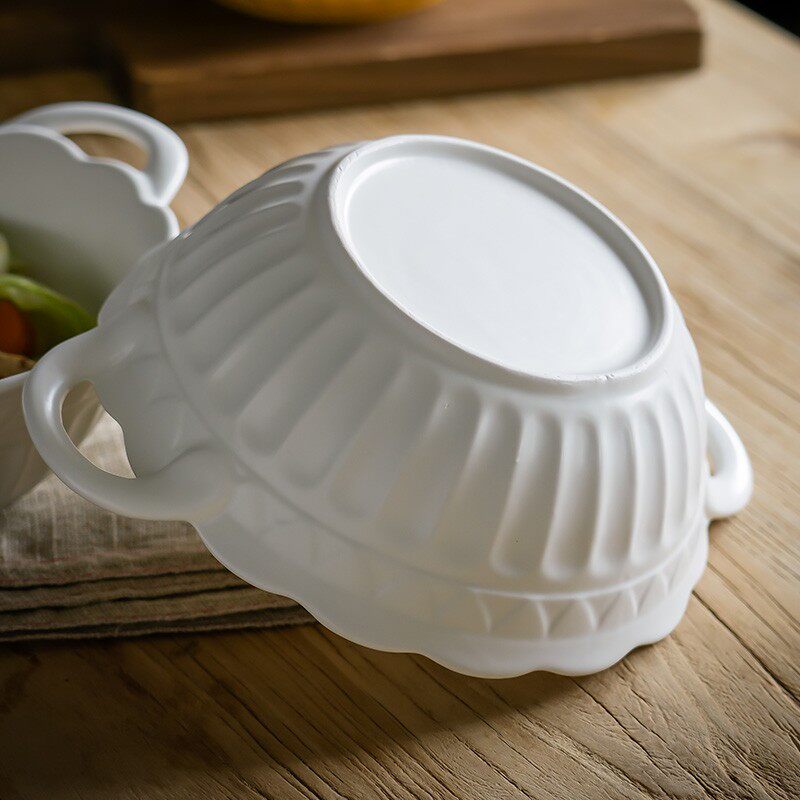 📚 陶瓷双耳汤碗日式白色荷叶边纹理家用餐具防烫设计加厚大容量面碗