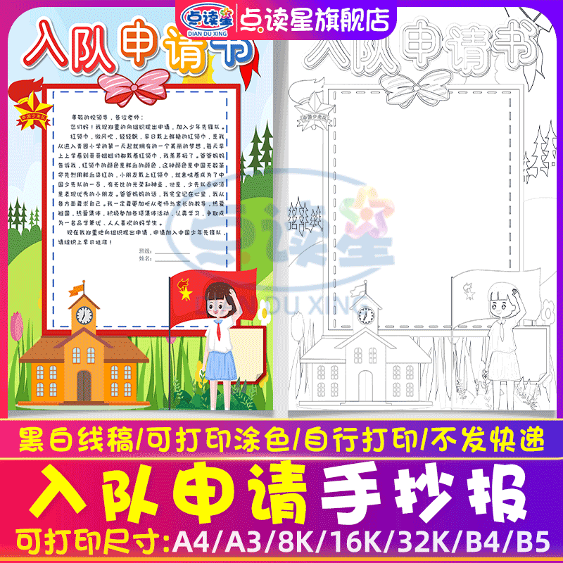 📚 小学生红领巾少先队员入队申请书儿童画竖版创意画手抄报A3A4线稿