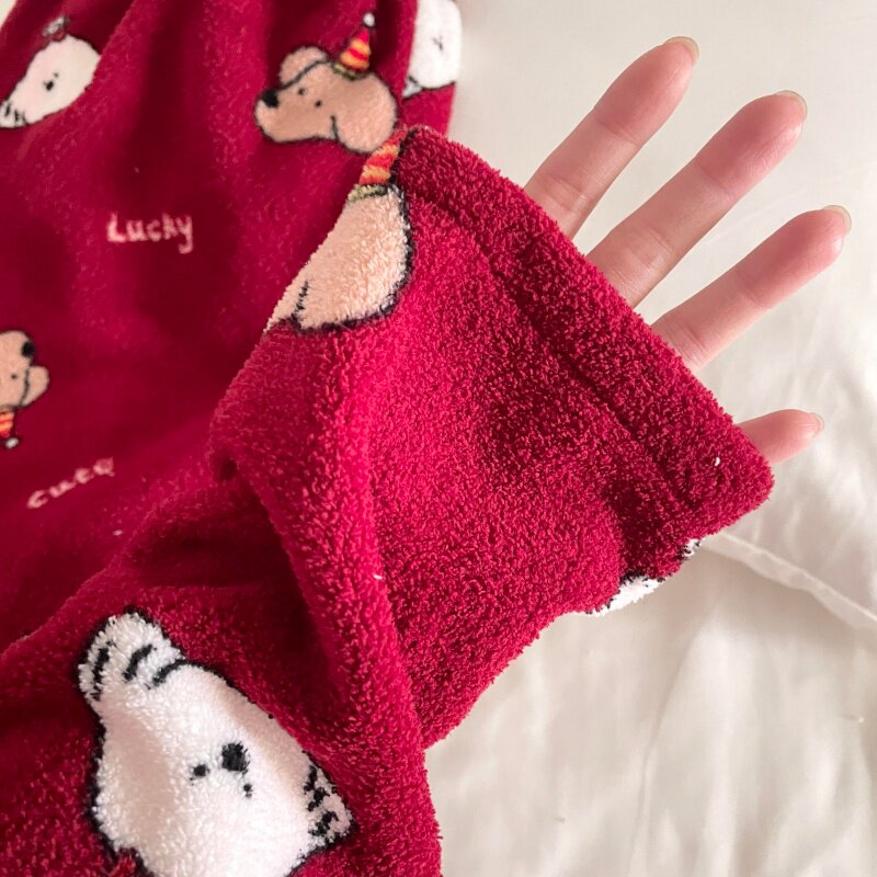 📚 侘町红底礼貌狗2026新款秋冬季雪粒绒加厚翻领女睡衣保暖家居服