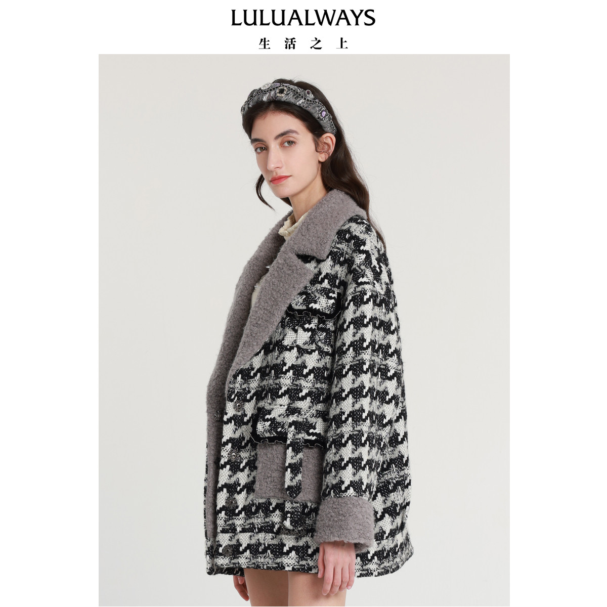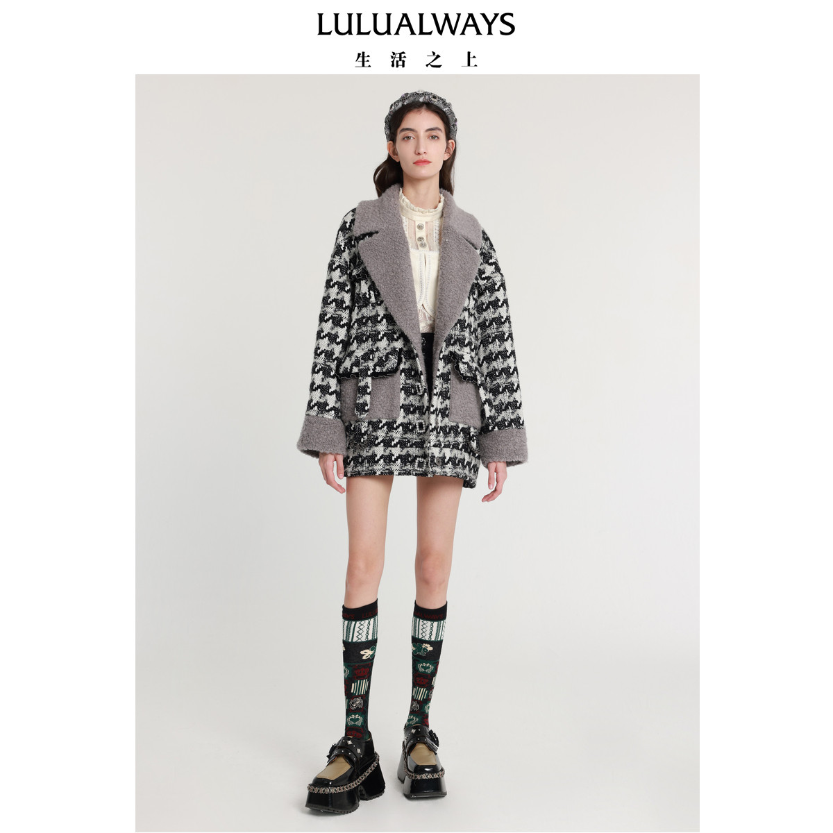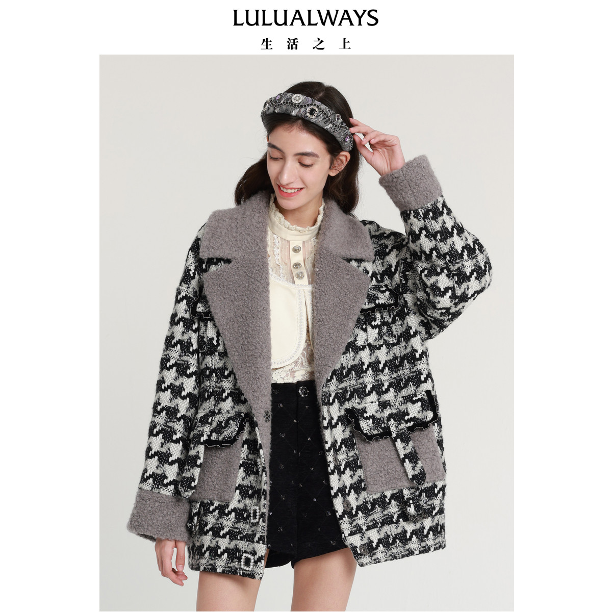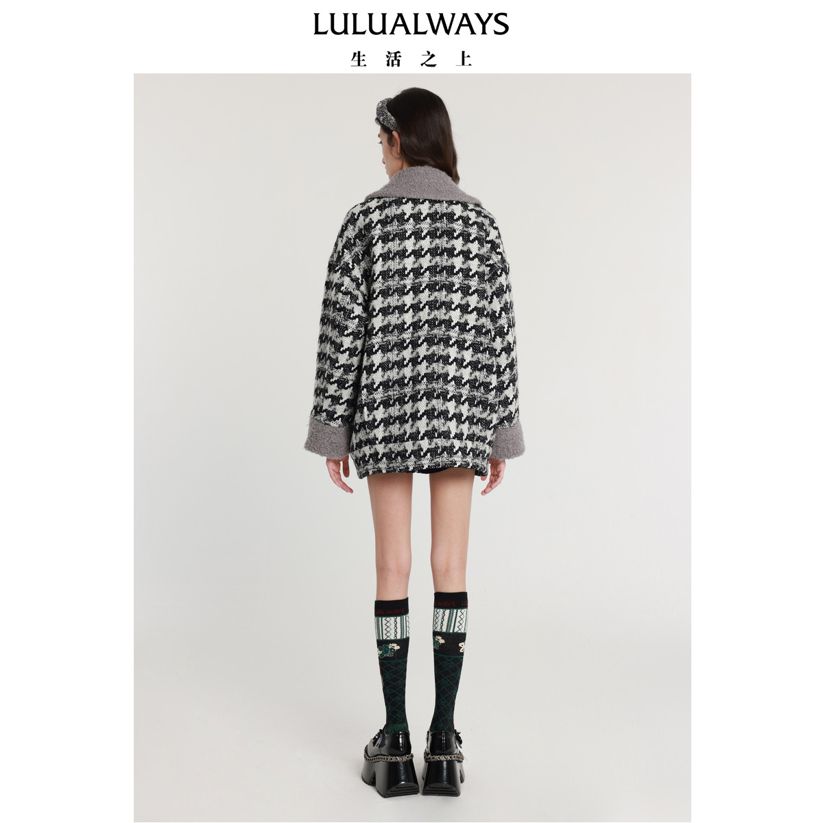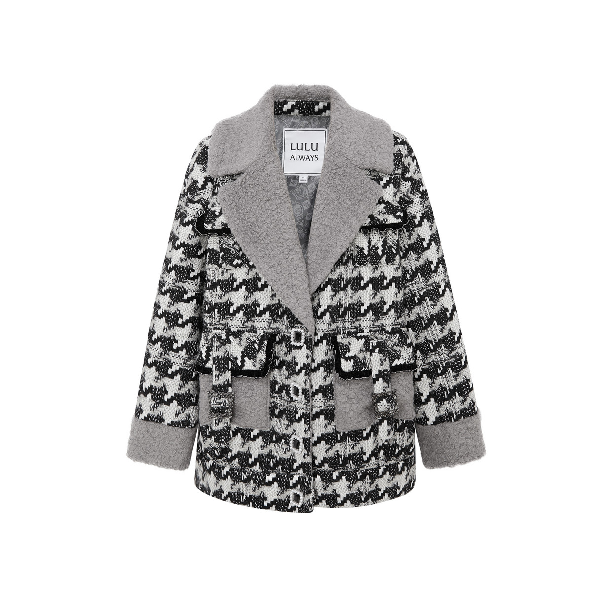 📚 LULUALWAYS我爱露露新款法式浪漫黑白提花毛呢大衣