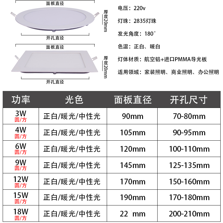 📚 led超薄筒灯嵌入式射灯平板3W格栅灯4寸洞灯12W18W方形孔灯面板灯