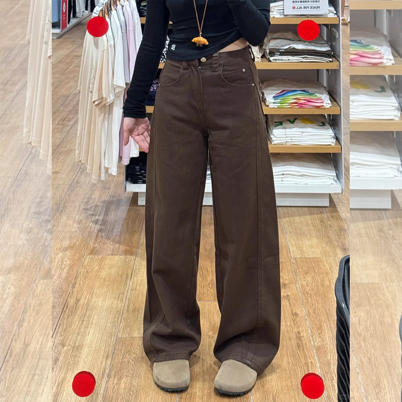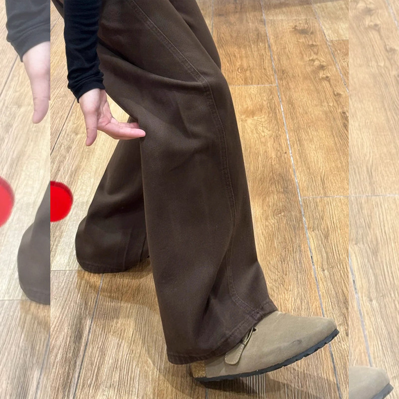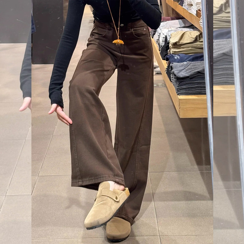 📚 秋冬季矮小个子咖色直筒裤加绒加厚弯刀裤145高腰窄版阔腿牛仔裤