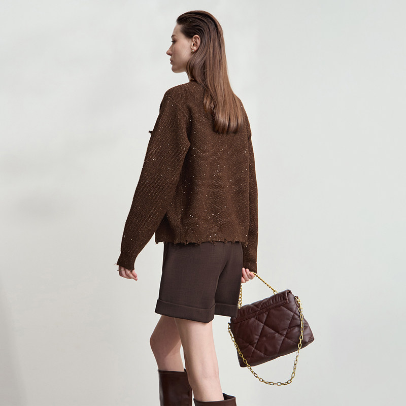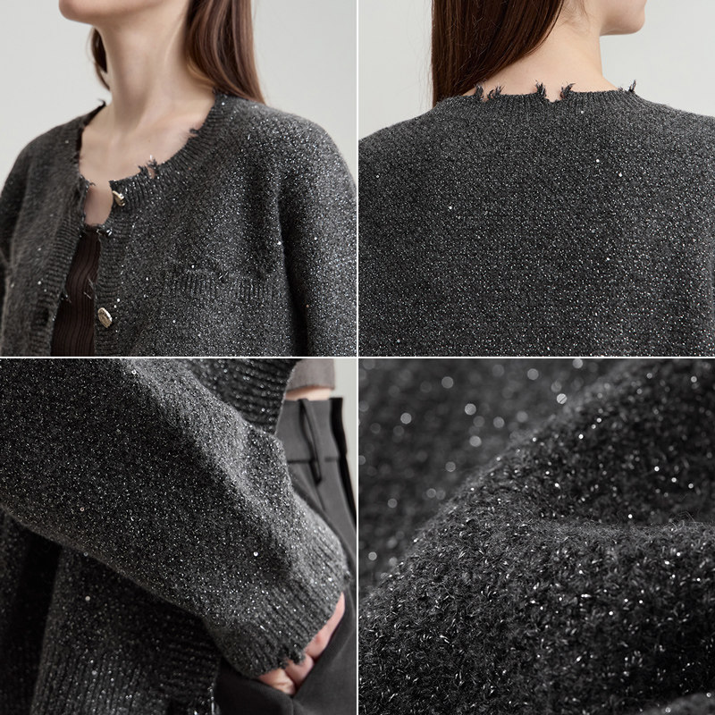 📚 Amii2025秋新款优雅香风珠片毛织开衫女圆领落肩袖手工毛边上衣